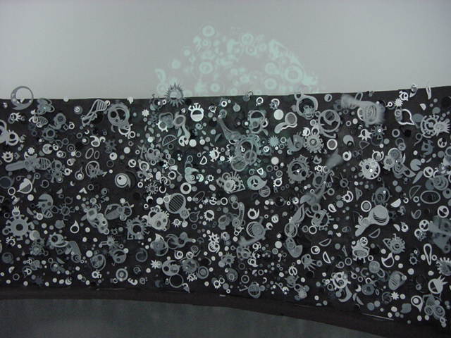 4 plasma monitors, 2 projected "curved surface screens" and 14 pillars compose "Passage". Some sounds are generated and some images change when people passes this passage and when people touch metal objects.- System
