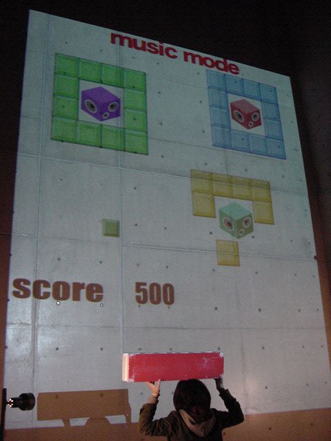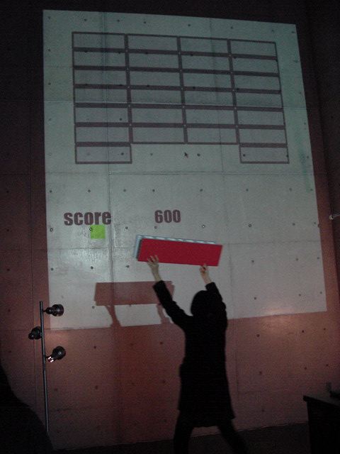 This is a simple/old block game with moving ball and racket, but the racket is controlled with big object which is moved by human. The position of the object is captured by web-camera and motion capture tool for Flash. This revised version has 3 musical modes in the game.- System