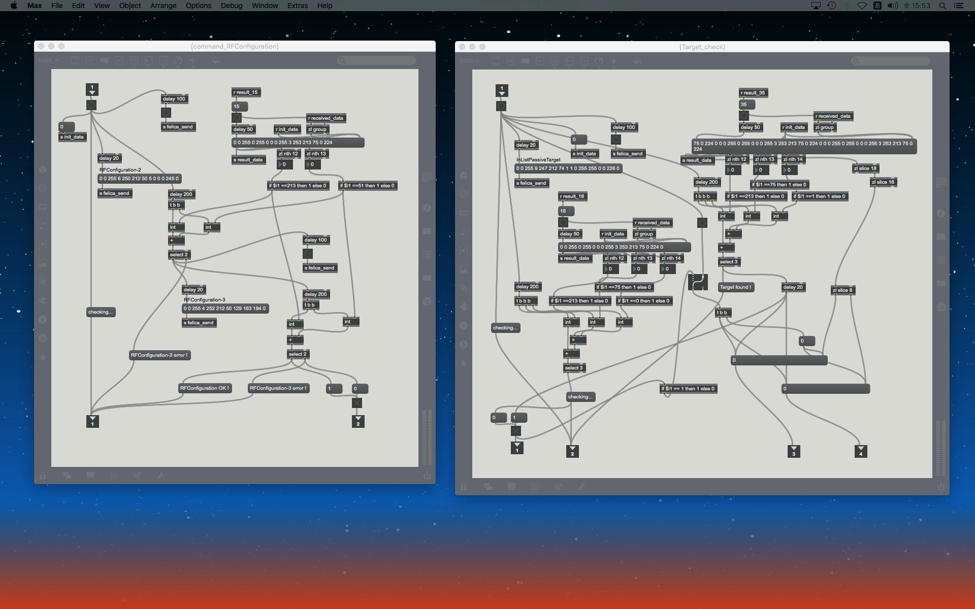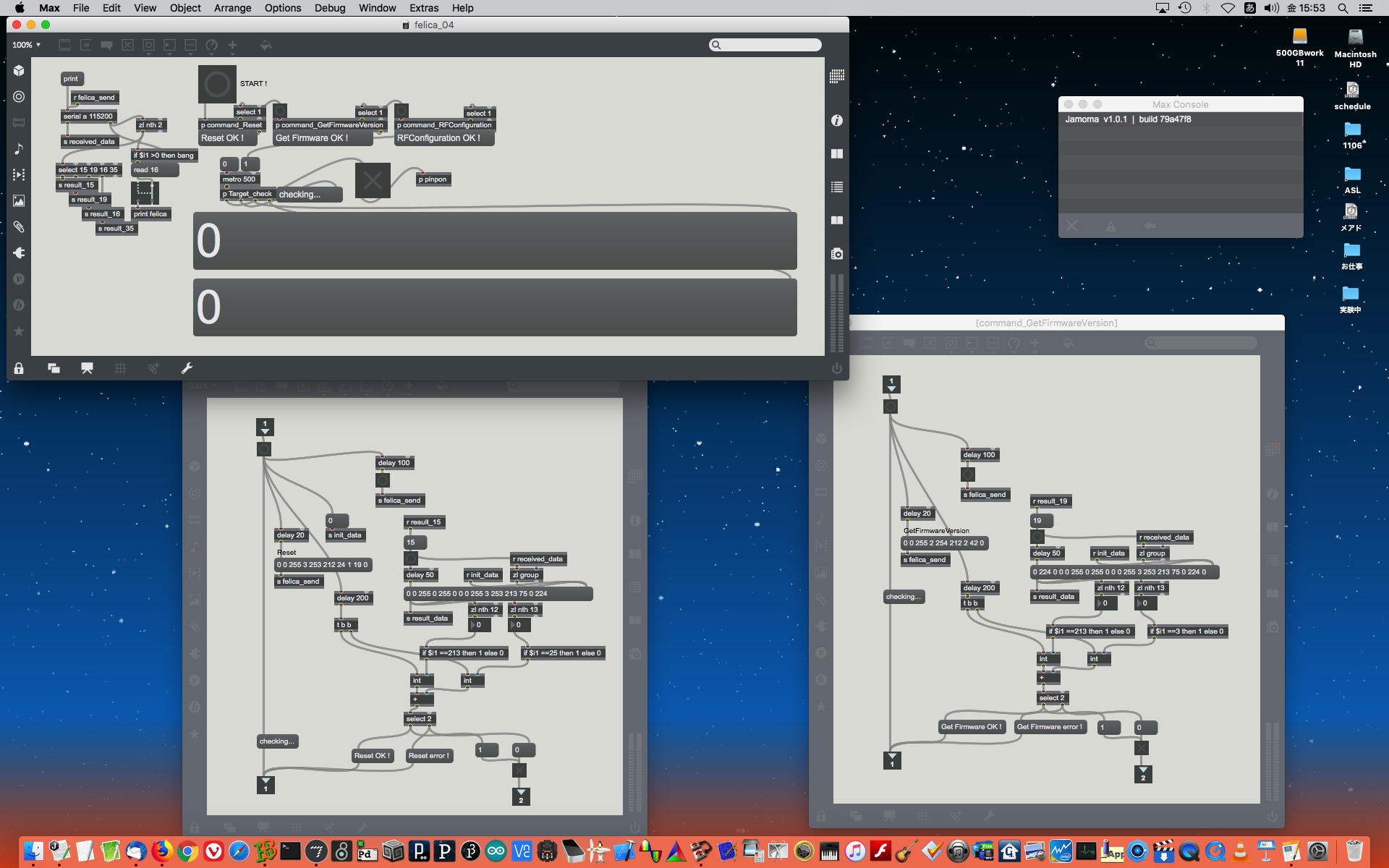 そして上の写真の3枚は、SUICAその他で国内どころか世界を席巻する、SonyのFelicaである。 こちらはスイッチサイエンスで購入したが、リンクが置かれていたSonyの簡易版リファレンス( ハード ・ ソフト )を参照して、MaxからダイレクトにRFIDリーダ/ライタとやりとりする以下のようなパッチを自力で開発してしまった。(^_^)