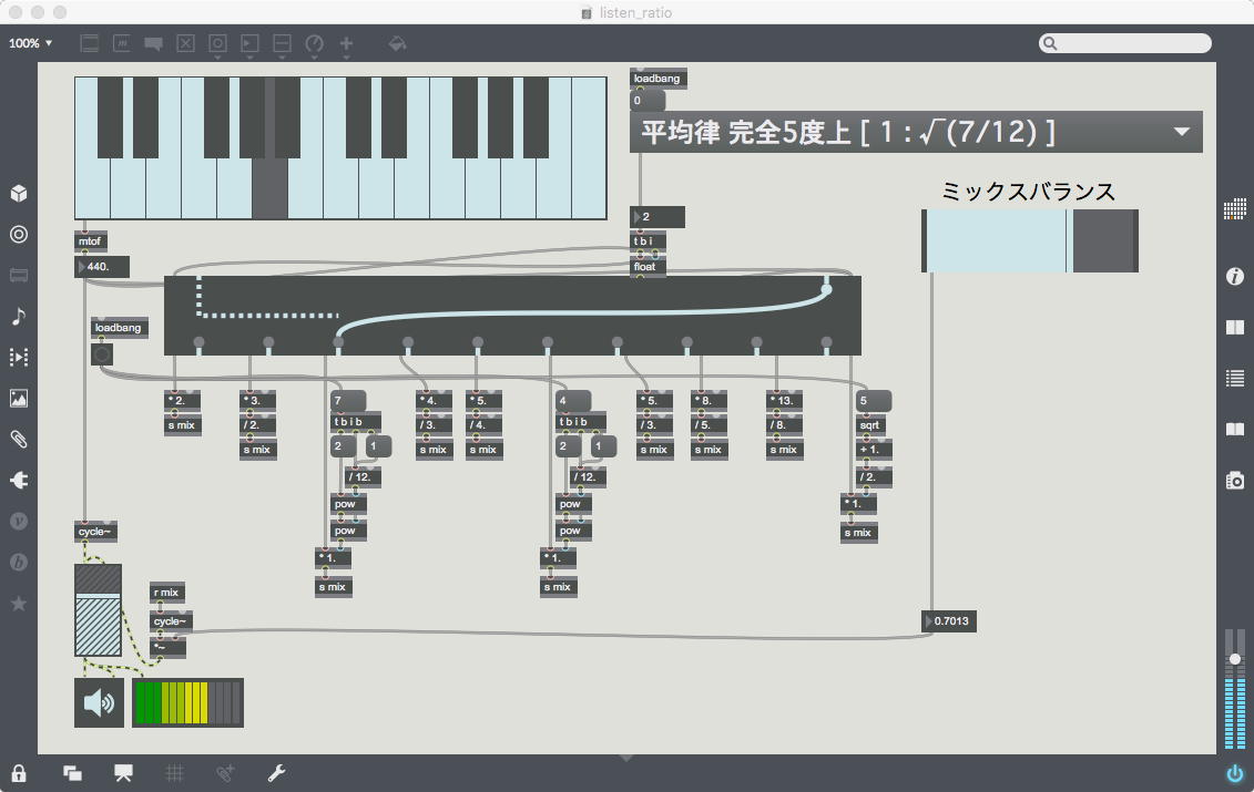 そしてフト思い出して、スキャナからWebに上げたのが、上の某大学入試問題(2017)である。 これはちょうど「サウンドデザイン」で今週からMSPによるサウンド生成・サウンド処理を扱うので、タイミングとしては最良であると気付いたのだ。 Max/MSPを使って平均律と純正律の違いを実際に聞き比べる、という以下のMaxパッチは既に作ってあるので、お話としてでなく実際に「耳」で確認してもらう事にした。