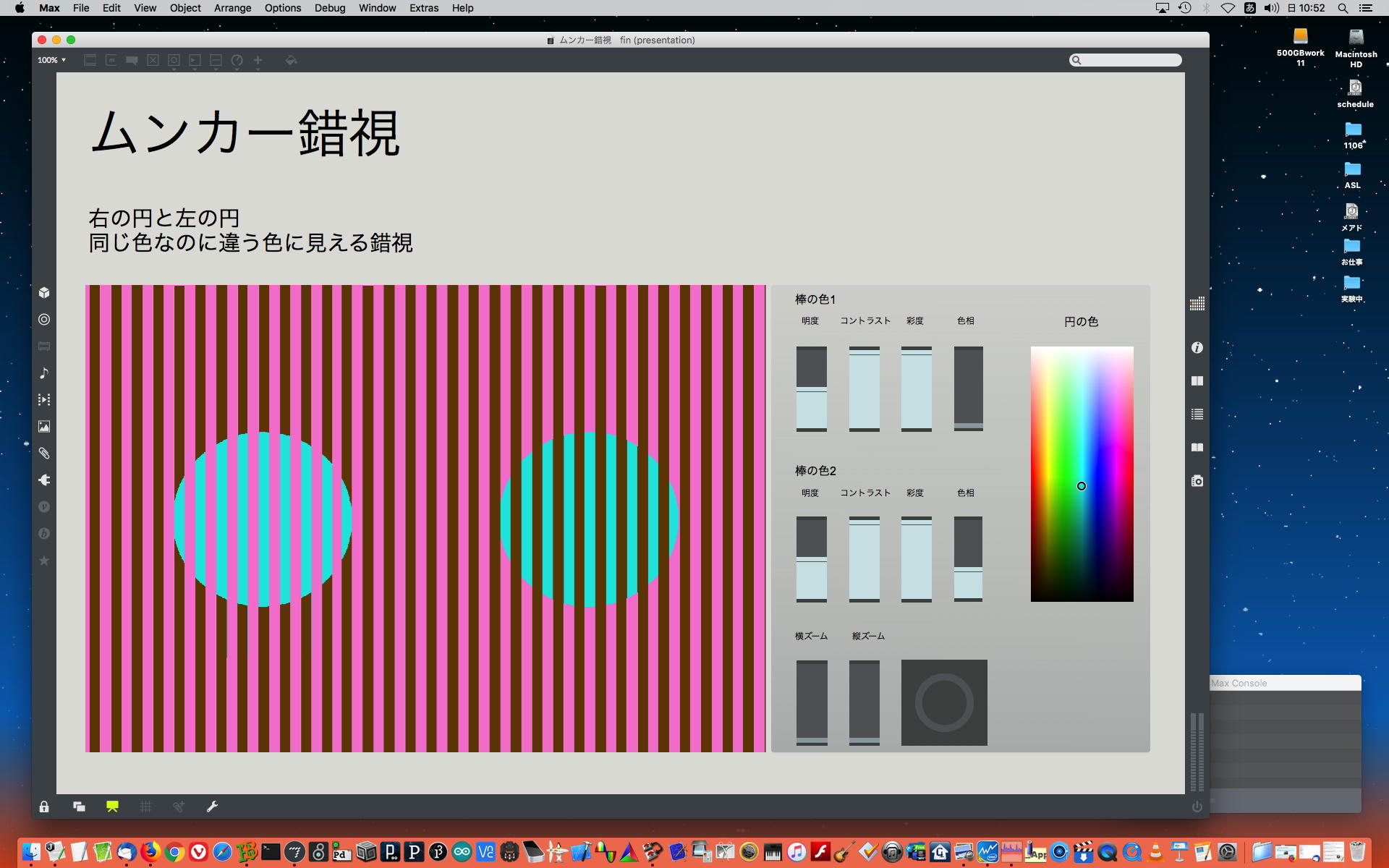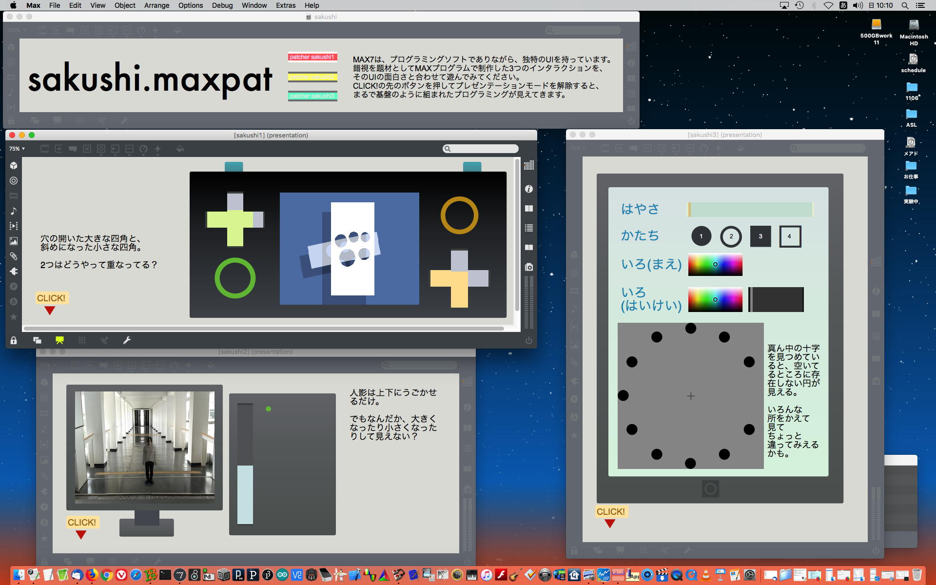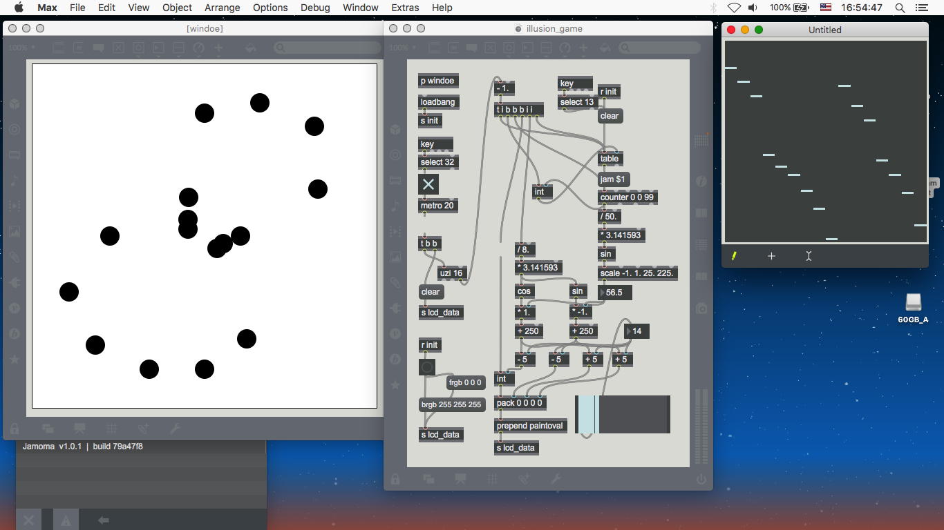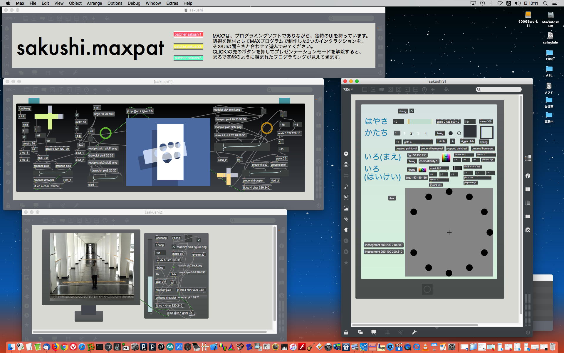 上のパッチは梅田那菜さんの作品で、梅田さんは去年の僕の専門科目を取っていなかったので、同様の提坂さんとともに毎週の補習でMaxを追いかけてきた。 このパッチは贅沢にも3種類の錯視のサブパッチがあり、さらにそれぞれにプレゼンテーションモードを設定して、スマートな画面とメイキング的なパッチの様子を「見せる」演出となっている。 後期には僕のゼミであれこれやっていくための「助走」としては、十分に成長してくれた。(^_^)