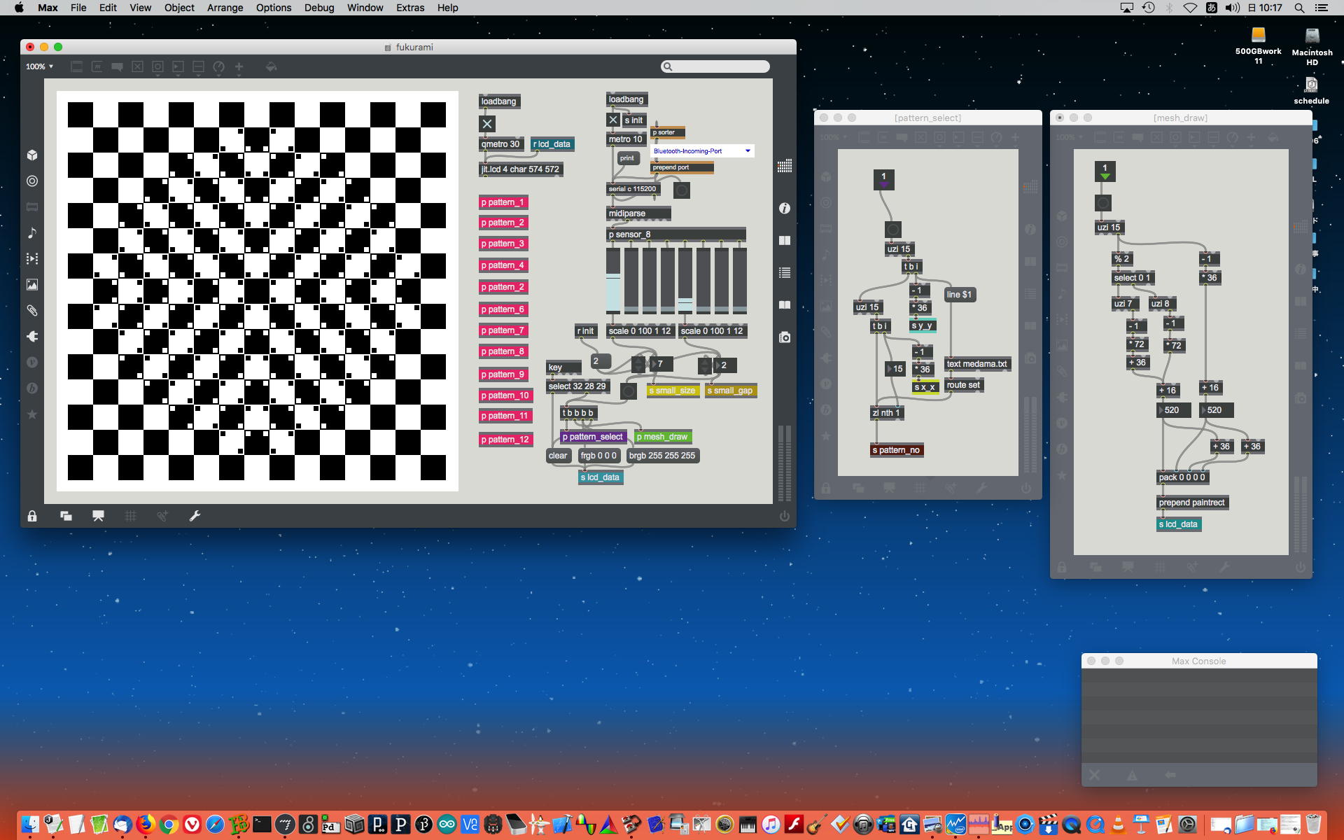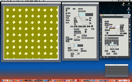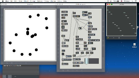 上のパッチは3回生の提坂理子さんの作品で、「絵心」系が苦手な学生はこのように数理造形できっちり出来る、というサンプルとなった。 数学的に古典とも言えるリサジュー図形の描画とともに、背景色・描画色・円の大きさなどを自動変化させるoptionを加えて、鍵盤でサウンドとともに7種類のパターンを選択できるようにした。