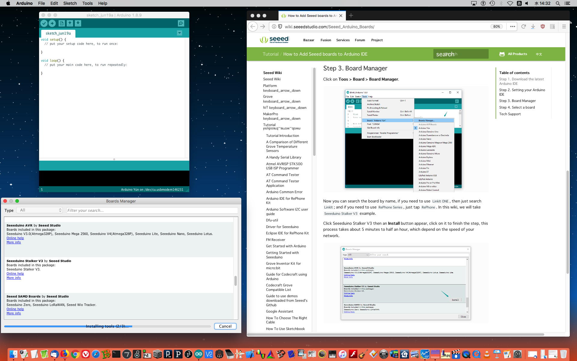 そして4限になってフト思い立ち、上のように 距離センサ と Seeeduino Lite との組み合わせを実験してみることにした。 まずは上のように、 このページ に従ってArduinoのIDEにSeeed社のライブラリをダウンロード/インストールして、とりあえず「Blink」が書き込めることを確認した。 ちなみにボードを「SeeeduinoLite」にするとともに、「Programmer」の指定は「Parallel Programmer」である。