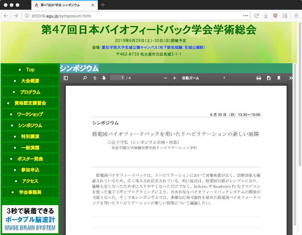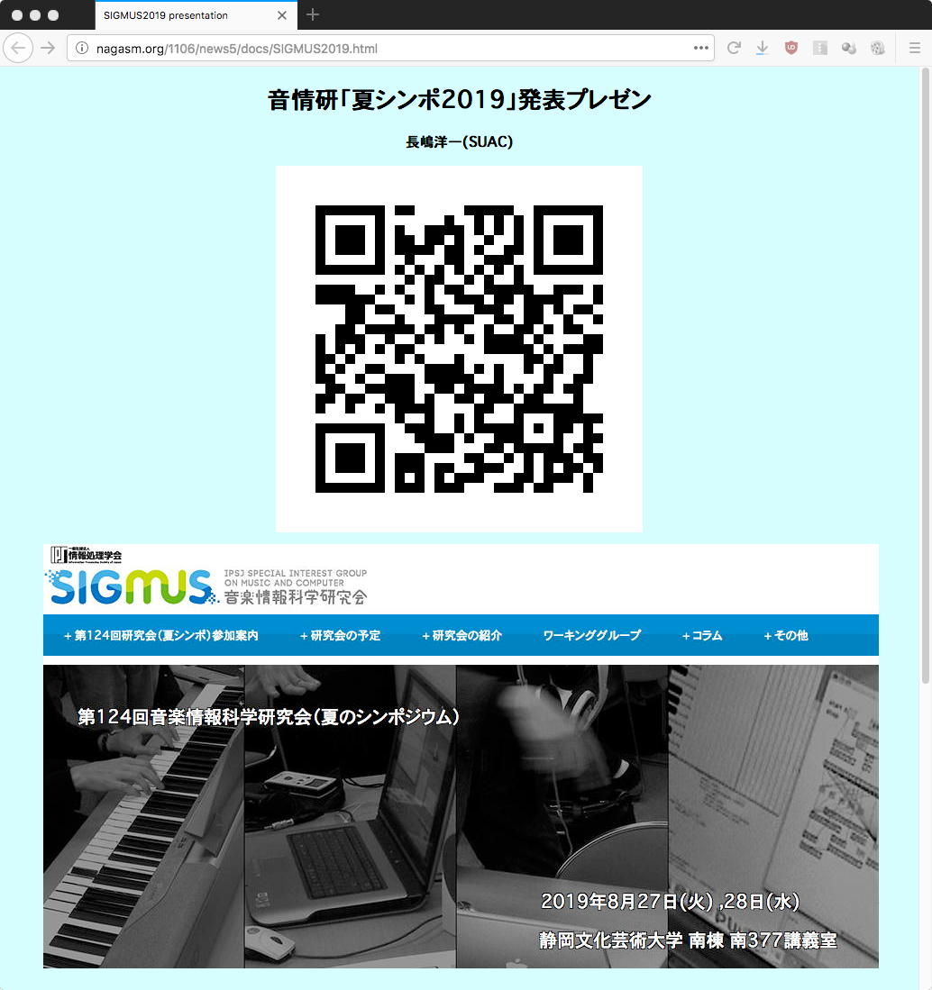 怒涛の学会発表シリーズとなった6月も最終週となって、今週末のBF学会大会でのシンポジウム講演で一区切りとなるが、肝心のプレゼンはこれから着手(^_^;)というどたばたである。 今日は2限にゼミの理子・那菜の二人がMaxプログラミングの補習にやって来るが、「サウンドデザイン」の課題1のために今日だけはGarageband大会になるかもしれない。 まず確認しておくと、「第47回日本バイオフィードバック学会学術総会」のWebサイトにある「シンポジウム」のページは、なんとHTMLでなく「PDFが並んだページ」という凄いデザインで当惑したが、とりあえずその4人(座長の辻下先生・長嶋・MDWワークショップに参加してくれた辻下先生の教え子の文京学院大の鈴木先生・照岡さん)の「概要」のPDFが これ である。 これだけで2.1MBというのはかなり無駄に大きい(^_^;)。 辻下先生からは「各シンポジストの発表時間は基本15分とさせていただきます。全体の持ち時間が90分ですので、半分を発表、半分を討論に当てたいと思います。今回辻下は司会に専念し、シンポジウムの趣旨説明とシンポジスト紹介に5分程度話をしますが、あとは討論のところで追加発言したいと考えます。できるだけフロアの方々と30分程度は討論できればと考えておりますので、短時間の発表ですが、どうぞご協力のほどお願いいたします」との指令があったので、なんと15分でこの内容をプレゼンする必要がある。 またまた「URLのQRコード画像」作戦で、別にWebページを作って、そこに誘導しつつザッと紹介・・・という感じになりそうである。
