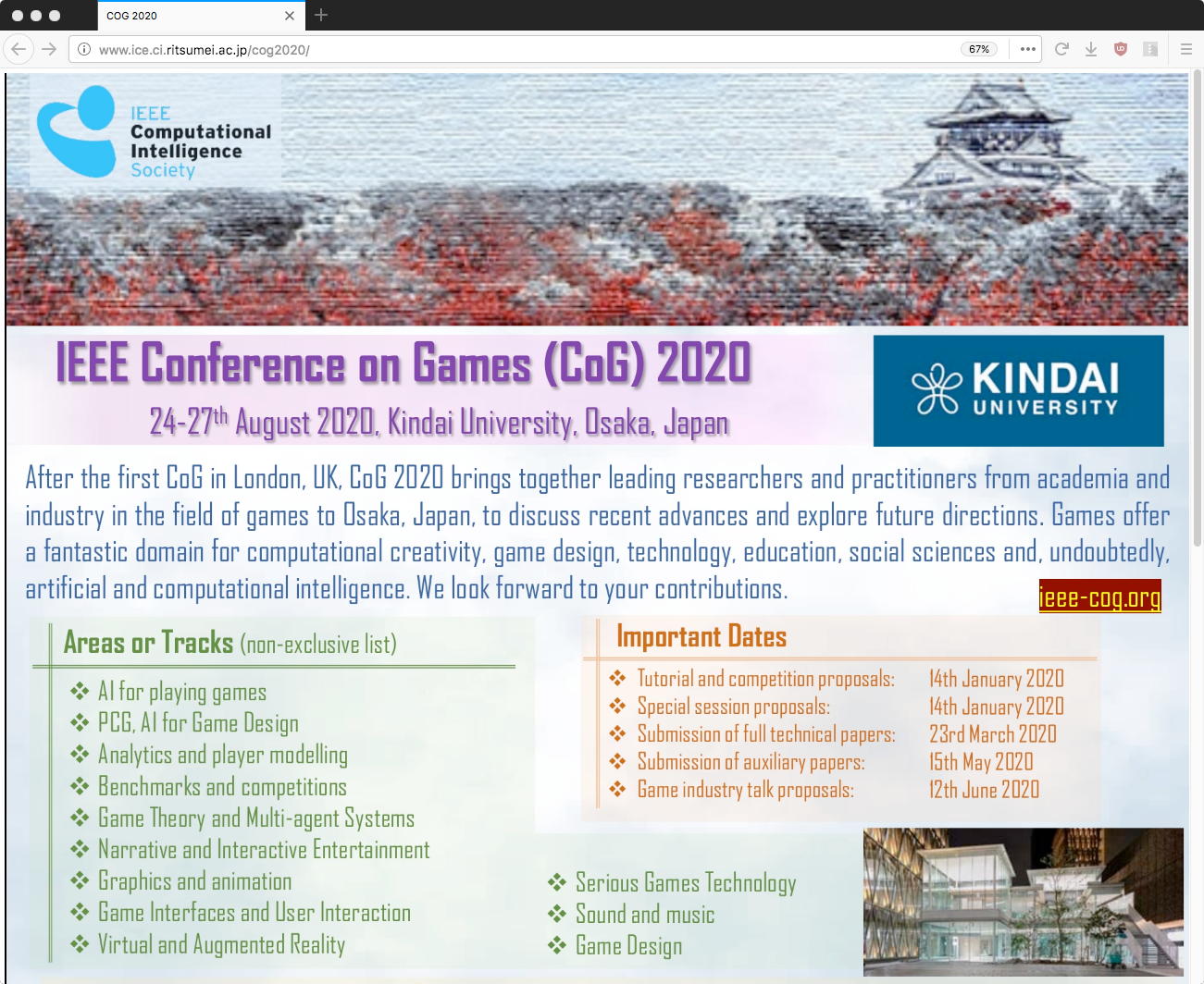 そして、昨日あれこれ行き来したAnthony Brooks先生の関係のメイルについては今朝も続報が届いていたので、ここで備忘録としてきっちりと見えるようにしておこう。 メイルの話題からすると順序が逆になるが、開催時期が前なのでまずは以下の CoG2020 である。 これはIEEEのゲームに関する国際会議のようで、ここにAnthony Brooks先生は招待講演として「呼んで欲しい」と立命館大のTHAWONMAS RUCK先生に投げかけたところ、例によって「会議の予算は限定されていて海外からの招待は難しい。企業に呼んでもらってくれたら嬉しい」という慇懃な回答があったところである。 今後の展開としては、ここにAnthony Brooks先生がハビリテーションの企画を提案してそこに我々が応募する・・・という展開で参加してみたいところだ。