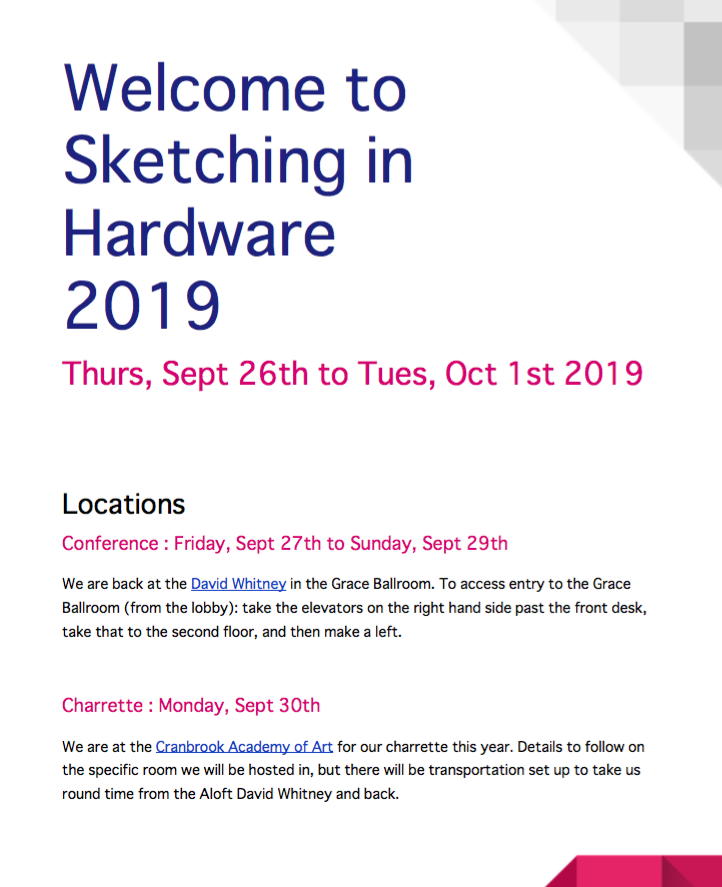 日々刻々と新しい話が舞い込んでくるので、あまり抱えず前倒しぐらいで片付けていくのが王道である。 今週は月曜にAnthony Brooks先生からのメイルで来年2020年の夏に向けての新しい話が始まったが、昨日はとりあえずとはいえ、今週末の第47回日本バイオフィードバック学会学術総会シンポジウムのための プレゼン をやっつけたところだった。 そして今朝、研究室に出てきてみると、遂に以下のようなSketching2019の続報が届いて、さっそく参加者登録サイトでの情報提出などのお仕事が発生した。 この3日間のあれこれは、抱え込んで一気に集中してしまったらパニックものだったところだ。