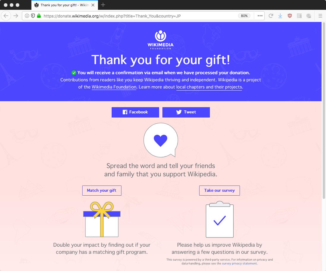 朝イチで研究室に出てきて楽しみなのは、昨日の夕方以降に届いていたメイルを読む瞬間であり、そこからどんな1日になるかが決まってくる。 今日は「アカペラに参加したい」という1回生からのメイルに「熱烈歓迎!」と返信するところからスタートしたので、テンションmaxである。 2限にはりこななのMax補習もあるし・・・というところに新たに届いたメイルのタイトルは「YOICHI - This is a little awkward」というものだった。 いきなり名前から始まるタイトルのメイルで良かった記憶は無いのだが、やっぱり毎年恒例の以下がまた届いた。 アカペラ新加入という歓喜が無かったら即刻削除していたのだが、順序が良かったので、きっちり読んでしまった。You made a donation to keep Wikipedia online for hundreds of millions of readers. I'm surprised by and deeply grateful for your continued support. You are part of the 1% of readers who donated to support Wikipedia. We need your help again this year. I ask you, humbly: please renew your donation today. Perhaps you’re thinking: Wikipedia will be fine if I don’t give today. Someone else always gives. It’s a little awkward to say this, but consider that fewer than 1% of readers donate to Wikipedia. It’s your generosity that keeps us going. The knowledge that what we’re doing matters, and it matters to people like you. It ensures Wikipedia is here for you when you need us. As I look around the internet today, I think back to when I first discovered Wikipedia. The internet was still a pretty free-wheeling place, and Wikipedia was born out of that spirit of creativity and possibility. The rest of the web has changed a lot - we all use the same few big sites, we do less creating and more consuming. But Wikipedia is still independent, still written by ordinary people, still has that can-do spirit. Let’s not change that. Please give today. If all our past donors gave again today, our fundraiser would be over within an hour. We’re not there yet. Please renew your gift and ensure that Wikipedia remains independent, ad-free, and thriving another year. Your gift’s impact is deeply felt, endowing our engineering and support staff with the resources they need to keep Wikipedia useful to you. While Wikipedia continues to reliably answer billions of the world’s questions each year, here at the Wikimedia Foundation, we focus on solving the challenges still facing our movement. Wikipedia does not yet serve everyone in the world. We’re not even close. So this year, our goal is to improve Wikipedia’s usability. We want to expand access in emerging economies, and welcome more diverse editors to our ranks. We want to use our clout to advocate for online privacy and freedom of information. As long as the internet exists, we pledge that Wikipedia will strive to make it a better place. Folks like you help us maintain our integrity, quality, and accessibility. You safeguard our non-profit mission. Please help us keep this wonderful website free and independent for another year, and do your part to make a better world for years to come. Now is the time we ask. If Wikipedia is useful to you, please take one minute to keep it online, ad-free, and growing another year. Katherine Maher - Executive Director, Wikimedia Foundation (Google翻訳) あなたは何億もの読者のためにウィキペディアをオンラインに保つために寄付をしました。 私はあなたの継続的な支援に驚いており、深く感謝しています。 あなたはウィキ ペディアを支援するために寄付した読者の1%の一部です。 今年もまたお願いします。 何卒よろしくお願いします。今日は寄付を更新してください。 多分あなたは考えている:私が今日与えないならウィキペディアは大丈夫だろう。 他の誰かがいつも与えます。 これを言うのは少し厄介ですが、1%未満の読者がウィキ ペディアに寄付すると考えてください。 私たちを前進させるのはあなたの寛大さです。 私たちがしていることが重要であり、それがあなたのような人々にとって重要であると いう知識。 それはあなたが私たちを必要とするときウィキペディアがあなたのためにここにあることを保証します。 今日インターネットを見回しているとき、私が最初にウィキペディアを発見したときのことを思い出します。 インターネットはまだかなり自由な場所であり、ウィキペディアはその 創造性と可能性の精神から生まれました。 ウェブの他の部分は大きく変わりました - 私たちは皆同じ少数の大きなサイトを使っています。 しかし、ウィキペディアはまだ独立 しています、まだ普通の人々によって書かれて、まだそのできる精神を持っています。 それを変えないでください。 今日与えてください。 私たちの過去の寄付者全員が今日再び寄付した場合、私たちの募金活動は1時間以内に終わります。 まだありません。 あなたの贈り物を更新して、ウィキペディアが独立 した、広告なしの、そしてもう一年繁栄し続けることを確認してください。 あなたの贈り物の影響は深く感じられ、私たちのエンジニアリングとサポートのスタッフがあなたにウィキペディアを役立つように保つのに必要なリソースを与えています。 ウィキペディアは毎年数十億もの世界の質問に確実に答え続けていますが、ここウィキメディア財団では、私たちはまだ私たちの運動が直面している課題を解決することに 焦点を当て