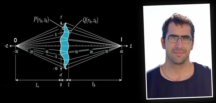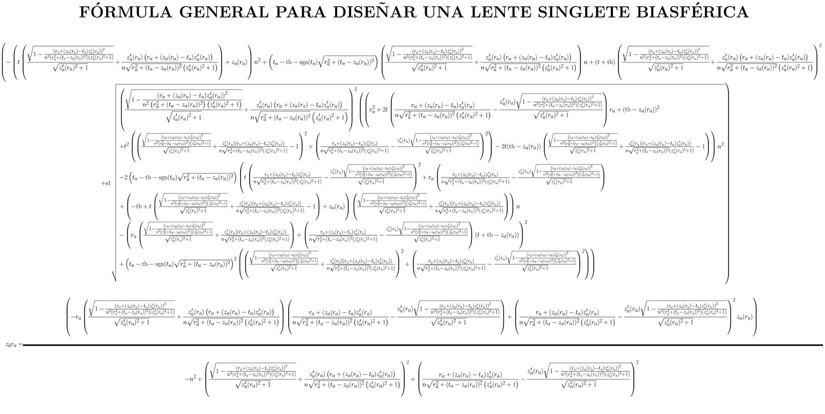さらにネットからのニュースで、「光学の歴史上で人類が2000年以上も解決できなかった[レンズの収差の解消]という難問をメキシコの大学院生Rafael Gonzalezが数学的に解決したと報じられた」というのがあった。 上の画像がRafael Gonzalez氏とその「500本の光線でシミュレーションを行い、有効性を計算したところ、すべての結果で得られた平均満足度は99.9999999999%だったという、解析的に導き出した球面収差が解消されたレンズの図」だという。 そしてその数式が以下であるという。 いやいや、こんな数式を考えている人がいるというのは、人類、まだまだ捨てたもんじゃないなぁ。