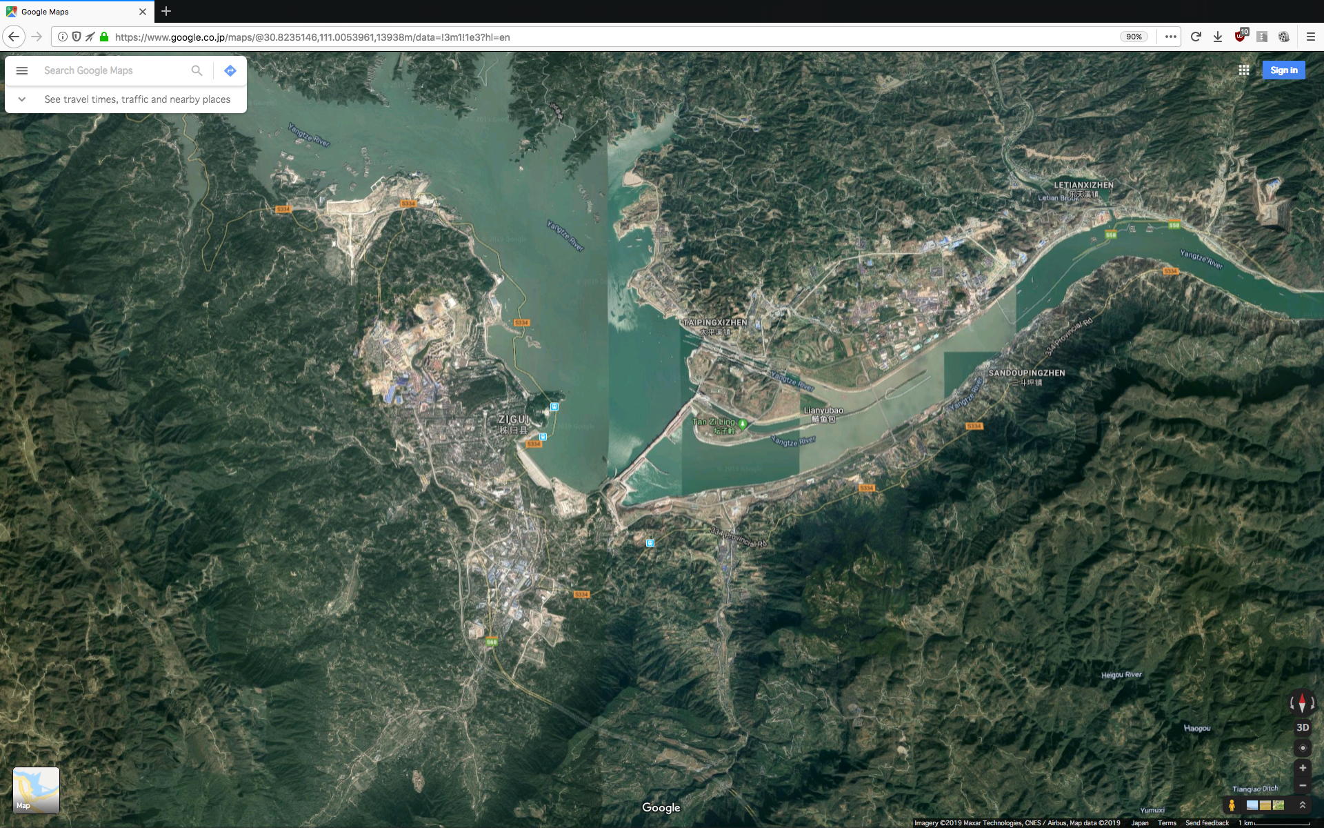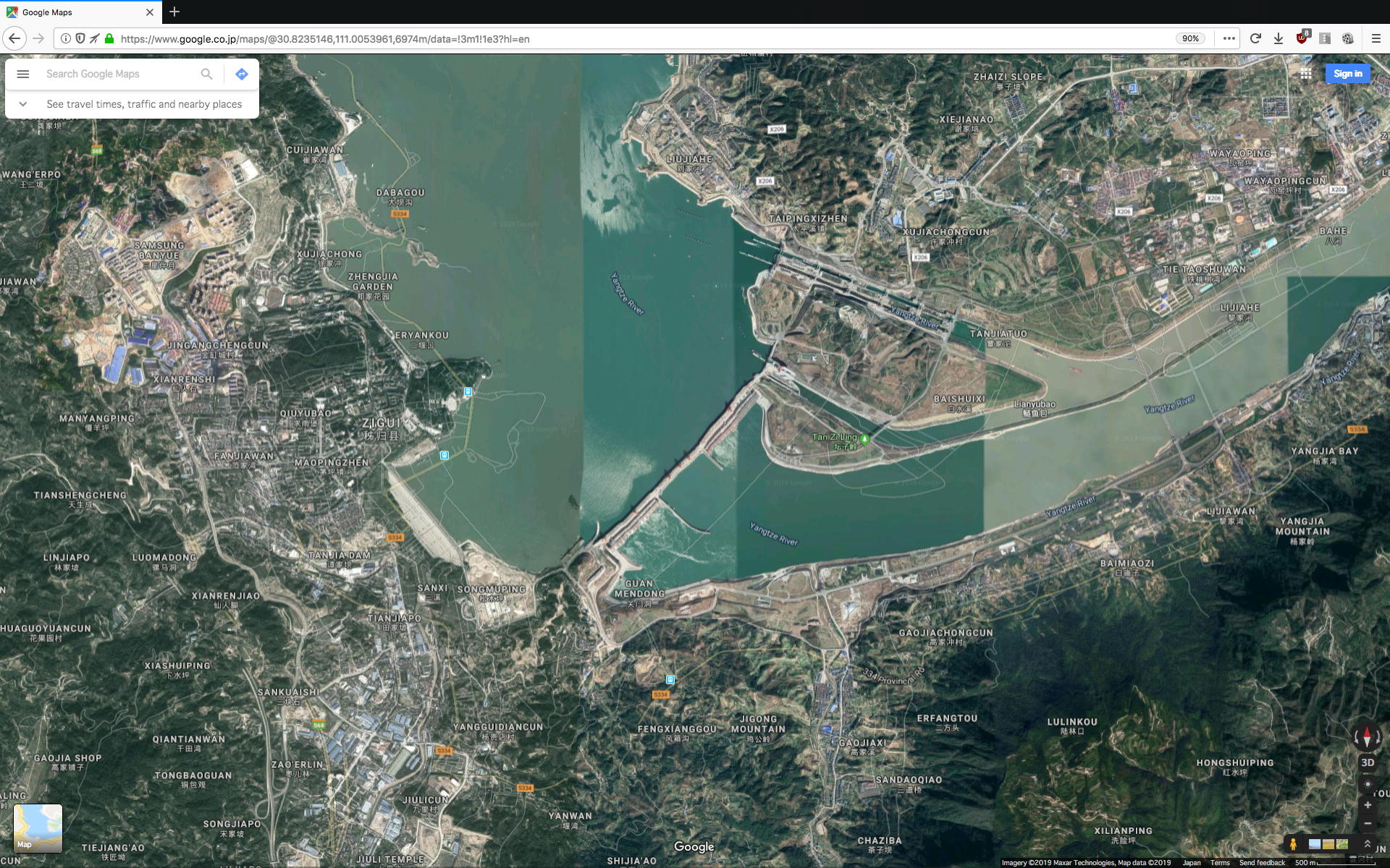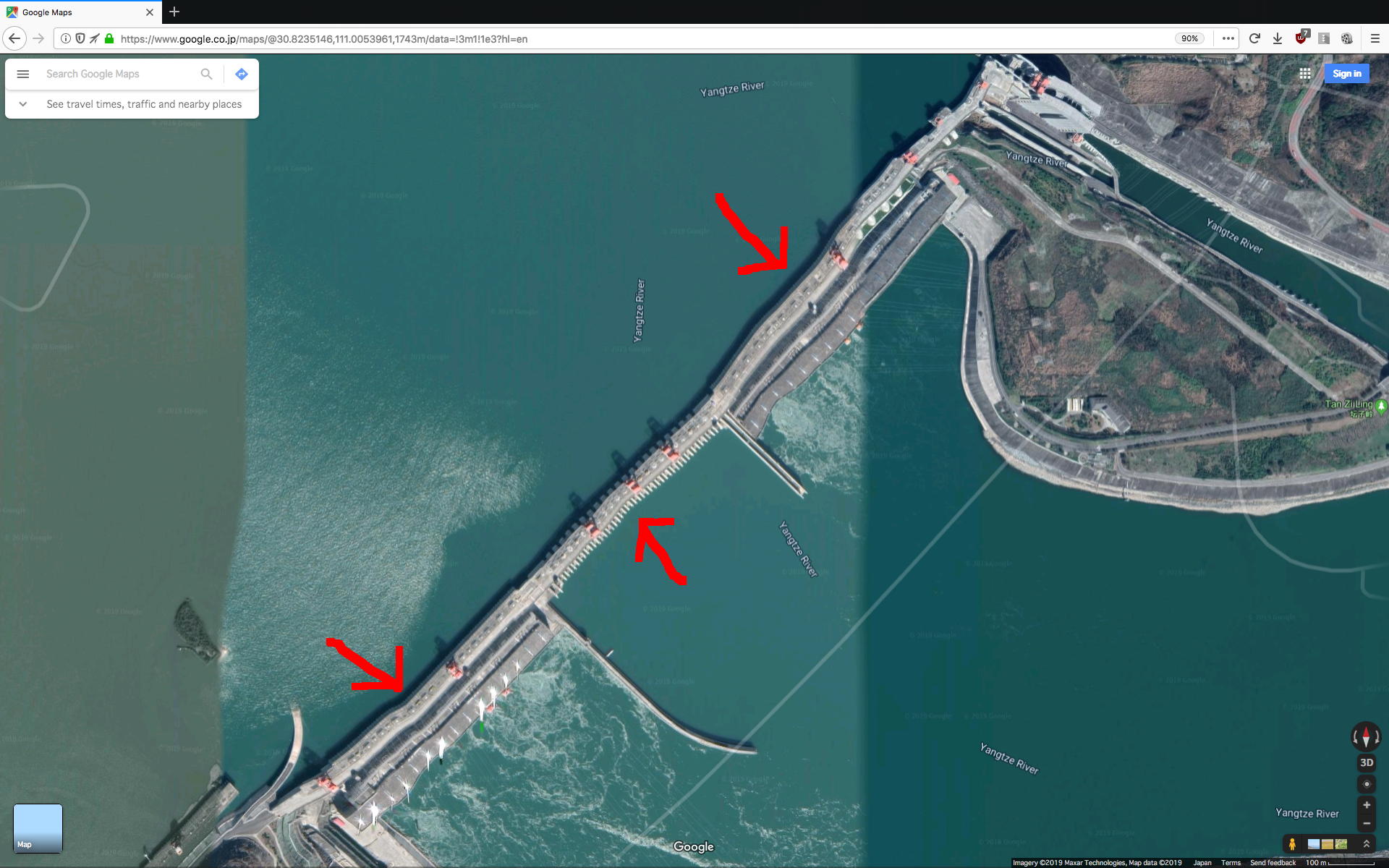 そしてネットニュースでは、「中国の三峡ダムを運営する国営・中国長江三峡集団は、三峡ダムの構造に問題はないと表明し、同ダムに決壊のリスクがあるとのネット上のうわさを否定した」というのがあった。 「ツイッターでは先週、グーグル・マップの衛星写真が掲載され、三峡ダムがゆがんでおり、決壊のリスクがあるとの投稿があり、この写真が国内のソーシャルメディアに拡散していた」なのだという。 そこでGoogleマップで「中国 三峡ダム」と入れると、以下のようにちゃんと出てきたが、どうもダムのアップ衛星写真は、確かに歪んでいる(^_^;)。 長さが3キロメートル近くもあるダムというのは、さすが中国というところで、日本ではちょっと有り得ない。 果たしてガセなのか真実なのか、これは今後の推移を見守るしかない。