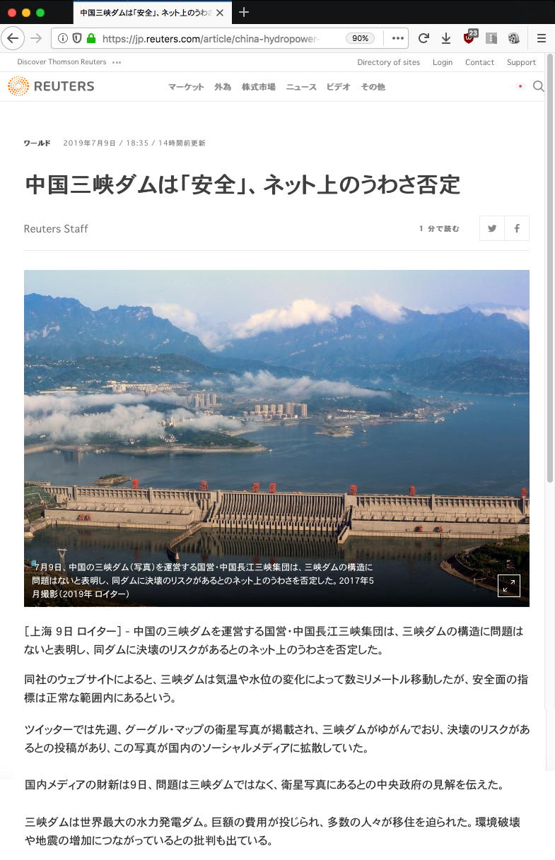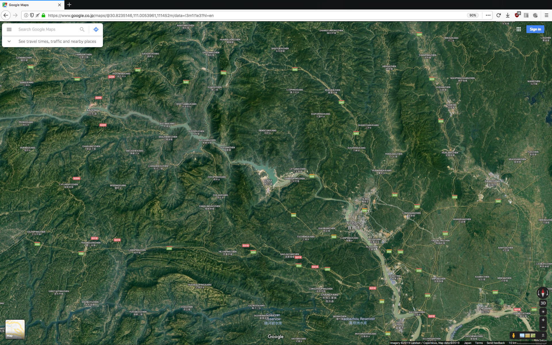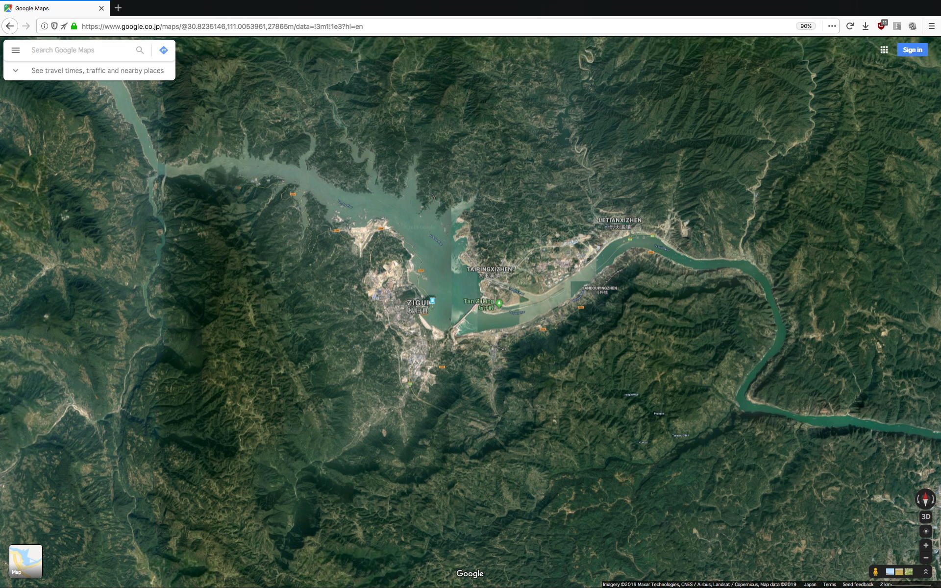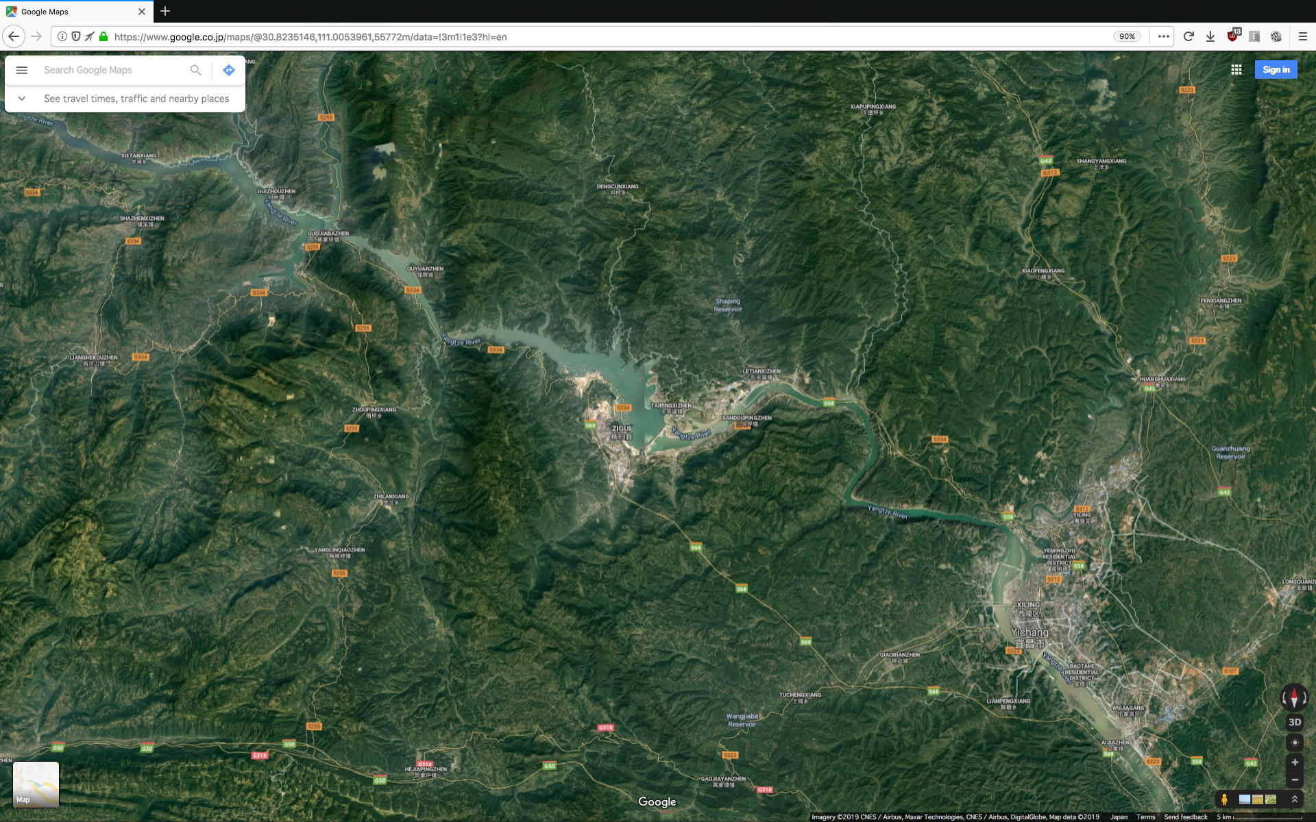 そしてネットニュースでは、「中国の三峡ダムを運営する国営・中国長江三峡集団は、三峡ダムの構造に問題はないと表明し、同ダムに決壊のリスクがあるとのネット上のうわさを否定した」というのがあった。 「ツイッターでは先週、グーグル・マップの衛星写真が掲載され、三峡ダムがゆがんでおり、決壊のリスクがあるとの投稿があり、この写真が国内のソーシャルメディアに拡散していた」なのだという。 そこでGoogleマップで「中国 三峡ダム」と入れると、以下のようにちゃんと出てきたが、どうもダムのアップ衛星写真は、確かに歪んでいる(^_^;)。 長さが3キロメートル近くもあるダムというのは、さすが中国というところで、日本ではちょっと有り得ない。 果たしてガセなのか真実なのか、これは今後の推移を見守るしかない。