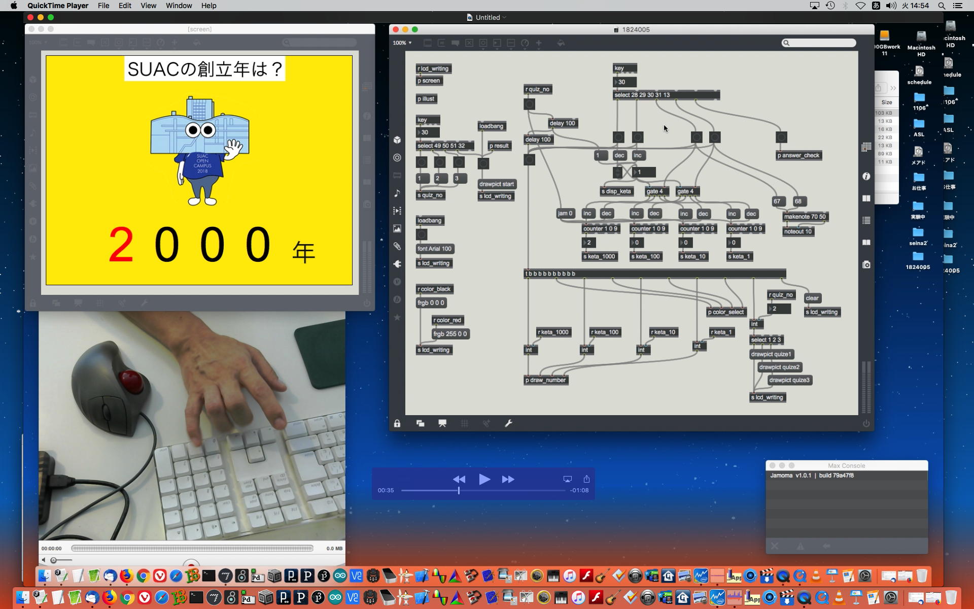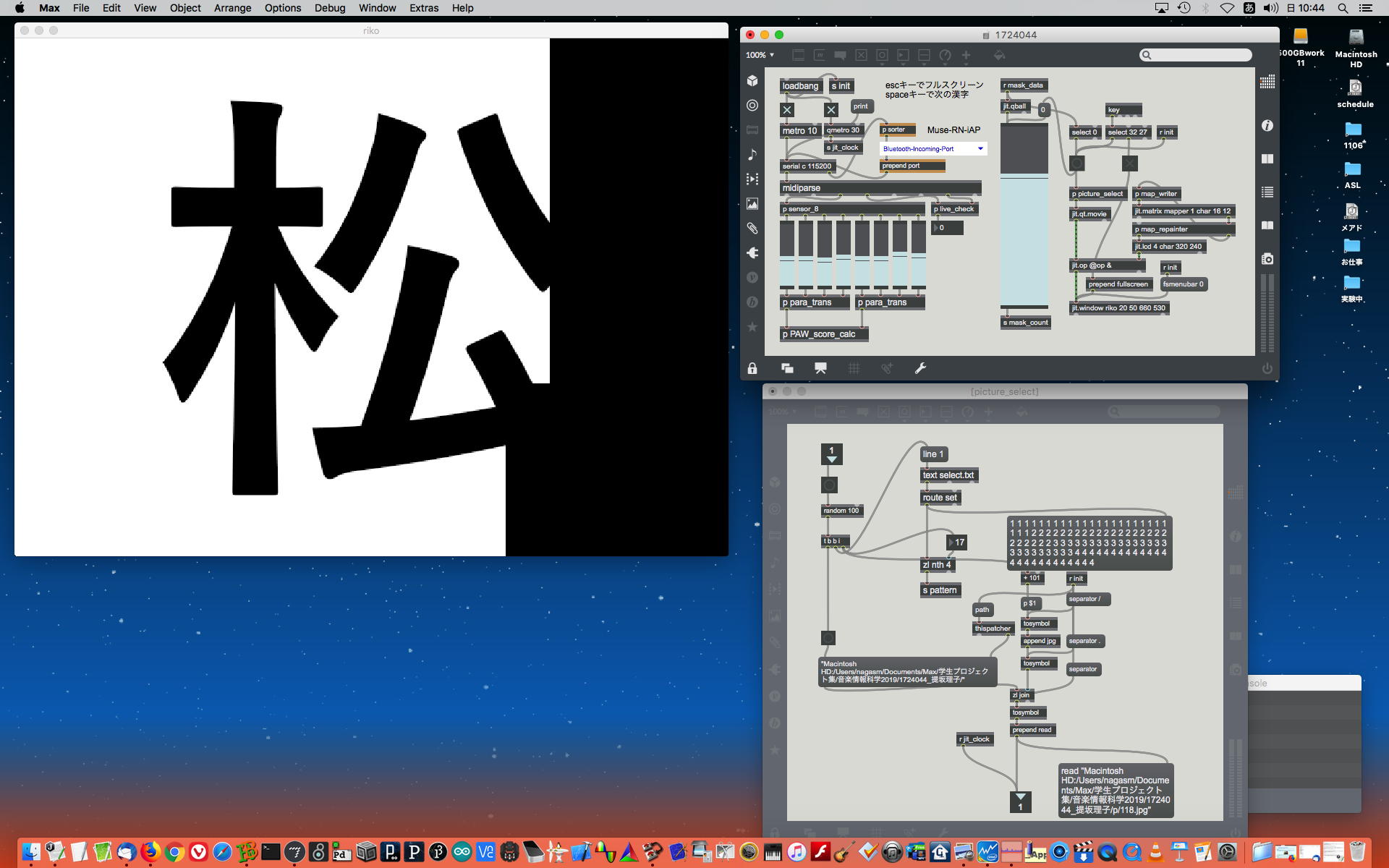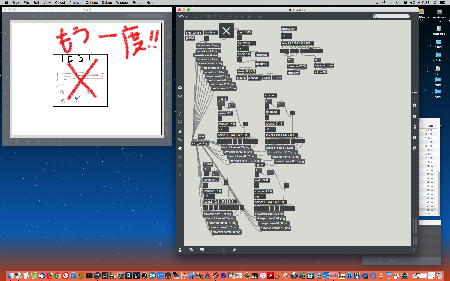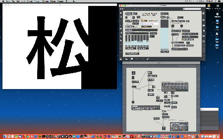 上のパッチは提坂理子さんの作品で、彼女は今年の2月(前年度)から領域変更で僕のゼミを志願してきて、梅田さんとともに補習でMaxを勉強しつつ、この前期には「サウンドデザイン」と「音楽情報科学」の両方を受講して追いかけてきた。 このパッチは僕が作ったPAWセンサ活用パッチの枠組みを活用しつつ、表示されるデータを全て制作して、「漢字の部首からじわじわ見えてくるのを当てる」というゲームに仕立てた。 僕のパッチではセンサの感度が厳しすぎて難易度が半端なかったが、このパッチではいい感じに設定できた。(^_^)