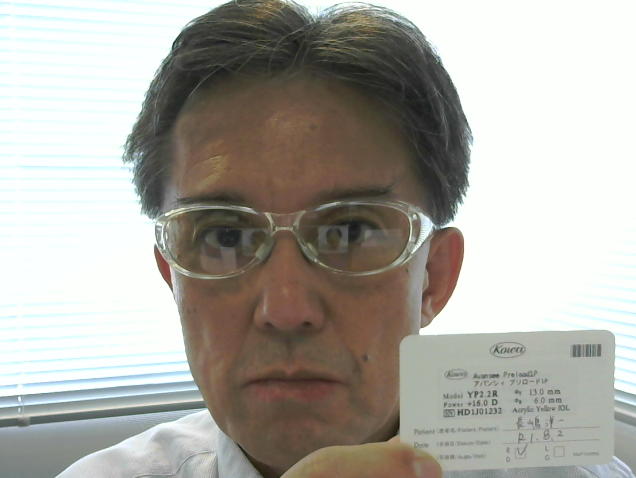 上の写真は、白濁した水晶体を砕いて除去したところに入れた眼内レンズの仕様である。 手術から3日間は抗生物質を飲み、1週間は上のような保護メガネをかけ(運転時以外)、1ヶ月は3種類の点眼薬(抗菌剤・ステロイド・抗炎症剤)を毎日4回、きちんきちんと点眼する必要があり、シャワー/洗顔解禁まであと3日である。 明日にも術後検診、術後1週間の金曜日にも検診・・・と今月中はぼちぼち検診も続くが、まぁ白内障なんてこんなものだろう。 扁桃腺を取った時には全身麻酔で記憶が無いが、麻酔点眼薬だけで完全に意識がある状態での手術というのは、まぁ面白いものだった。 眼内検査装置が女性の合成音声で「スタートします」みたいな事を英語で言うと、その後は変態的テルミンみたいな非音楽的ピッチの連続音が鳴っていて、果たしてこれはどんなセンサ情報に対してピッチをマッピングしているのかな・・・などと考えていたら15分程度で終わってしまった。 もう片方の左目は緑内障も白内障も無いので、当面、手術はこれでオシマイである。