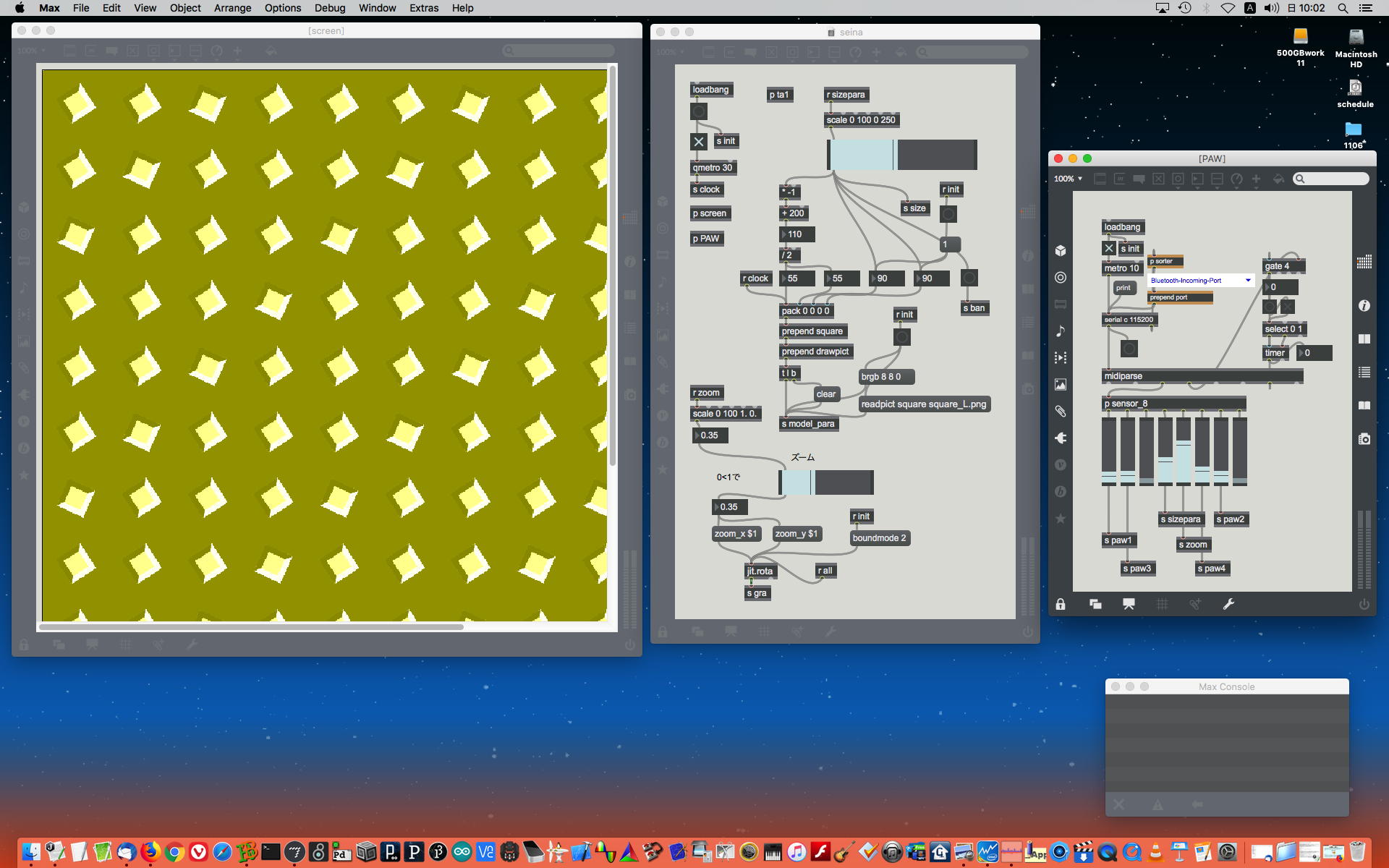 上のパッチは井上聖菜さんの作品で、元々は このポスター にあった錯視図形(多数の陰影正方形が一定のルールで回転して並ぶ)を、PAWセンサによってそれぞれの回転角度やズーミングなどのパラメータをインタラクティブに変化できる一種のゲームのように仕立てたものである。 去年から僕の専門科目を全て取ってきた実力が見事に発揮された。(^_^)
