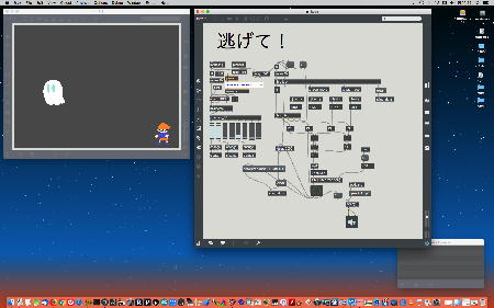 上のパッチは久保巨樹くんの作品で、「順に動いていくキャラを正しい位置でシューティング」という先輩の名作をコンテンツ差し替えで改訂した作品である。 こうなると勝負はそれぞれの「絵心」となるが、この作品はいい感じでオープンキャンパス模擬授業でもウケていた。