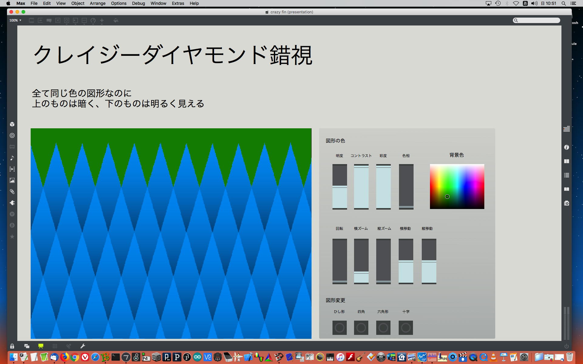 上のパッチは田口舞さんの作品で、彼女も去年から僕の専門科目を全て取ってきて、後期からは僕のゼミに決まったので、こちらも有望株である。 上のように、有名な「クレイジーダイヤモンド錯視」・「ムンカー錯視」をインタラクティブに自在にパラメータを変えられるようにしてあり、単なる静止画ベースの「錯視画像」とは段違いの面白さとなっている。 梅田さんに続いて田口さんもプレゼンテーションモードを活用してスマートに仕上げているのもさすがである。(^_^)