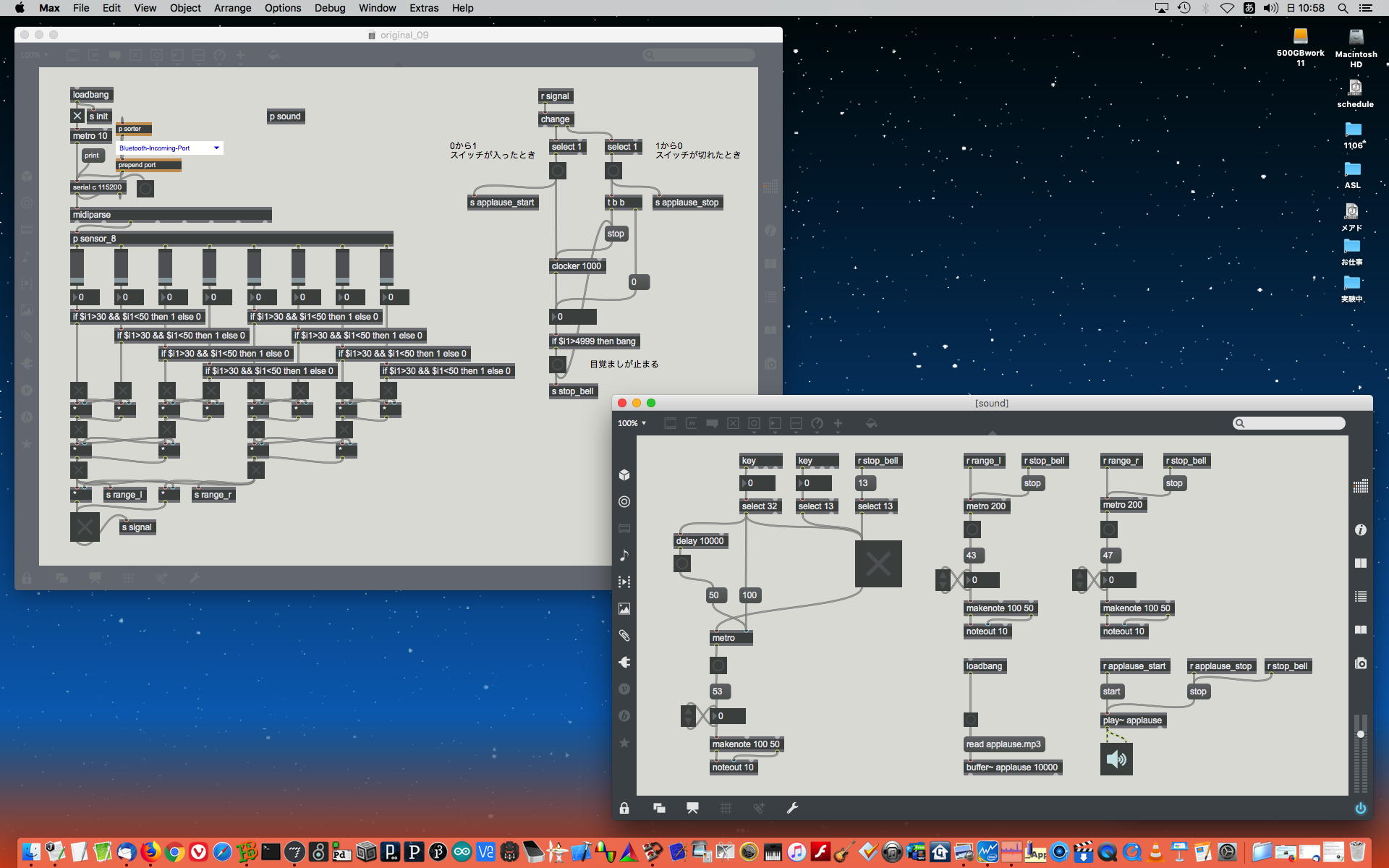 この作品は現在でも動態保存作品として現役であり、1106研究室のパソコンとともに貸し出して、野口さんが浜松での個展とか東京ビッグサイトでの展示に持っていったこともある。 本人がほつれたフェルトを修復してくれたこともあり、最強のデモ作品である。 そういえば今年の「サウンドデザイン」の講義でも、 このように 学生に見せてデモって、がっちりMaxへの興味として引き込んだところだった。(^_^)