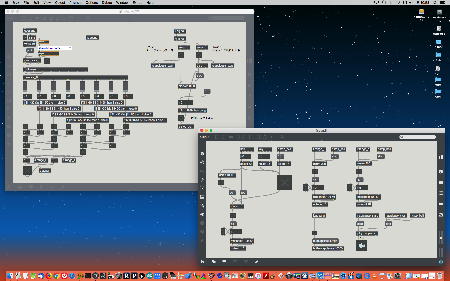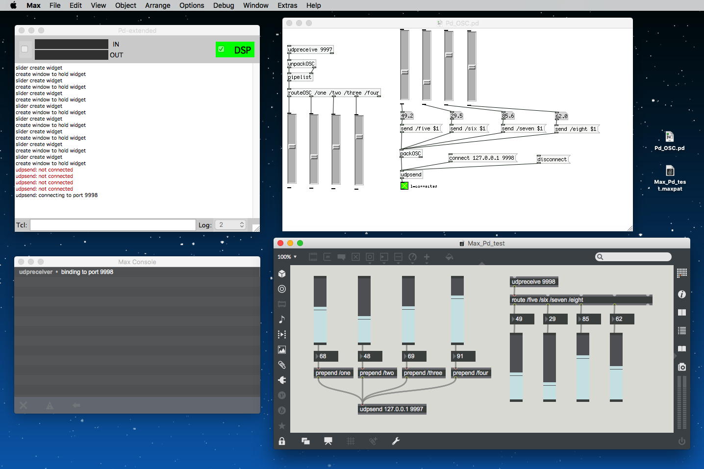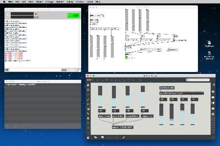 そして午後の幸せな2時間ほどで、なんと上のように、「MaxからPureDataにOSCで4パラメータを送る」・「PureDataからMaxにOSCで4パラメータを送る」という PureDataパッチとMaxパッチのペア が出来てしまった。 要するに、2013年の PuteData日記 では、実際にPureDataを使うというよりは、PureDataサイトの「紹介」をまとめていただけだったので、実際にやってみたのはこれが初めてとなった。 動作の様子は このように なった。