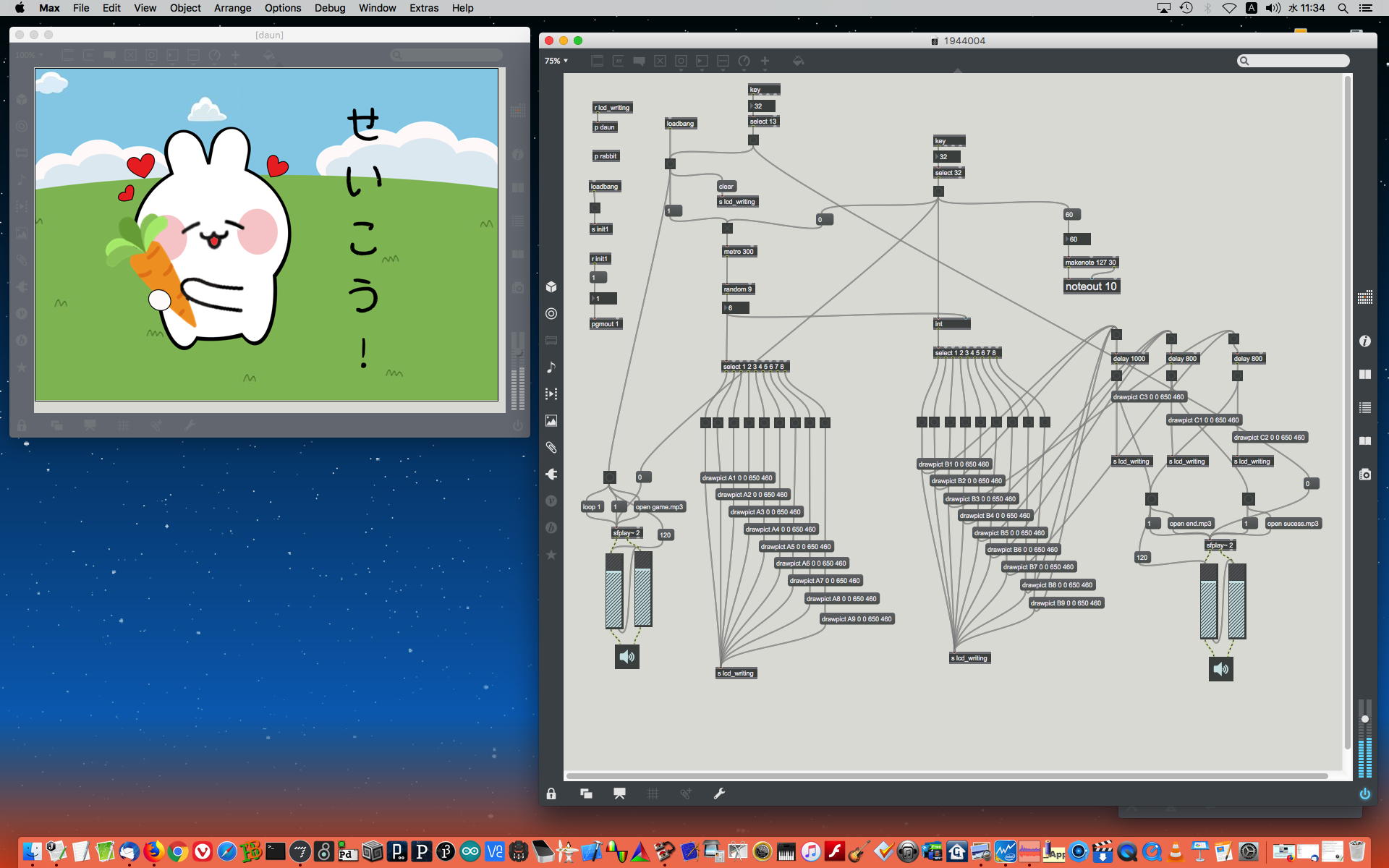 上のパッチは丹羽亮介くんの作品で、これも「順に繰り返す画像→スペースを押した瞬間に対応した画像が出る」というものであるが、なかなかテンポ(難易度)のチューニングが絶妙で、まずまず成功するゲームに仕上がった。 爆弾に繋がっている複数の電線から正しいものをニッパーで切断したら成功で、失敗すると爆発する・・・というテーマの作品企画は過去にもあったが、ちょうど世界で爆弾テロが頻発した時勢に、当時の学科会議で「よろしくない」と企画を否定されて作品制作に進めない(涙)、という悲劇的なことがあった。 僕は全力で反対したのだが、そういう政治的な圧力に負けずに自由な発想で作品制作する学生を支援したいものである。