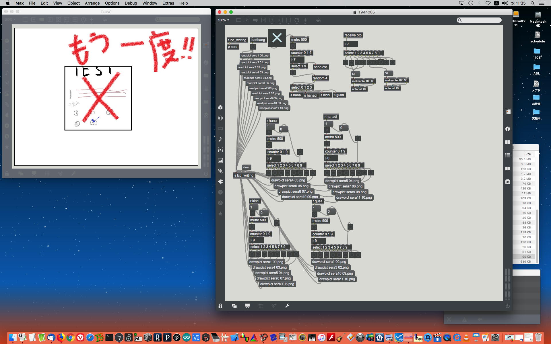 上のパッチは3回生の入戸野菜々さんの作品で、提供した「先輩Max作品パッチ集」の中にいくつもサンプルのあった「占い系」であり、絵心のある学生は、その中から「枠組み」をいただいて、表示されるコンテンツ(画像)だけオリジナルに差し替える・・・という作戦が流行している。 一定パターンが進んだ最後にrandomで結果シーンが選択される、というものである。