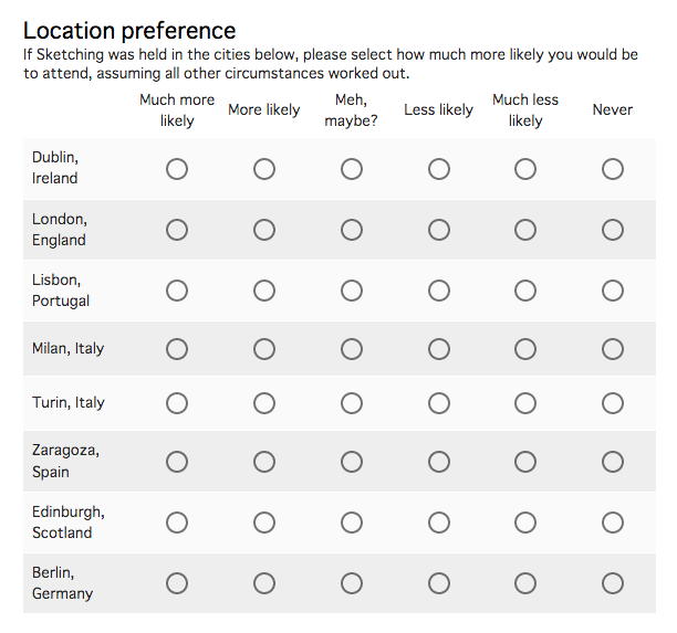 そんな中、Mike KuniavskyからSketchingコミュニティへのメイルとして、なんと「I know, we haven't even done Skeching 2019, but we're already thinking about Sketching 2020, largely because we want to move it to Europe and to have it earlier in the year, so we're planning now.」というのが届いた。 かつてロンドンでのSketchingに行ったものの、基本的には北米というか米国での開催だが、来年は久しぶりに欧州だという。 上がアンケートの候補地だが、どこでもOK、これは楽しみだ。