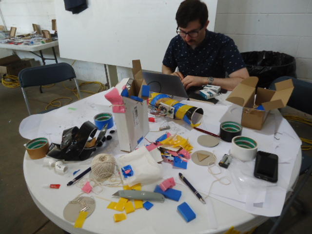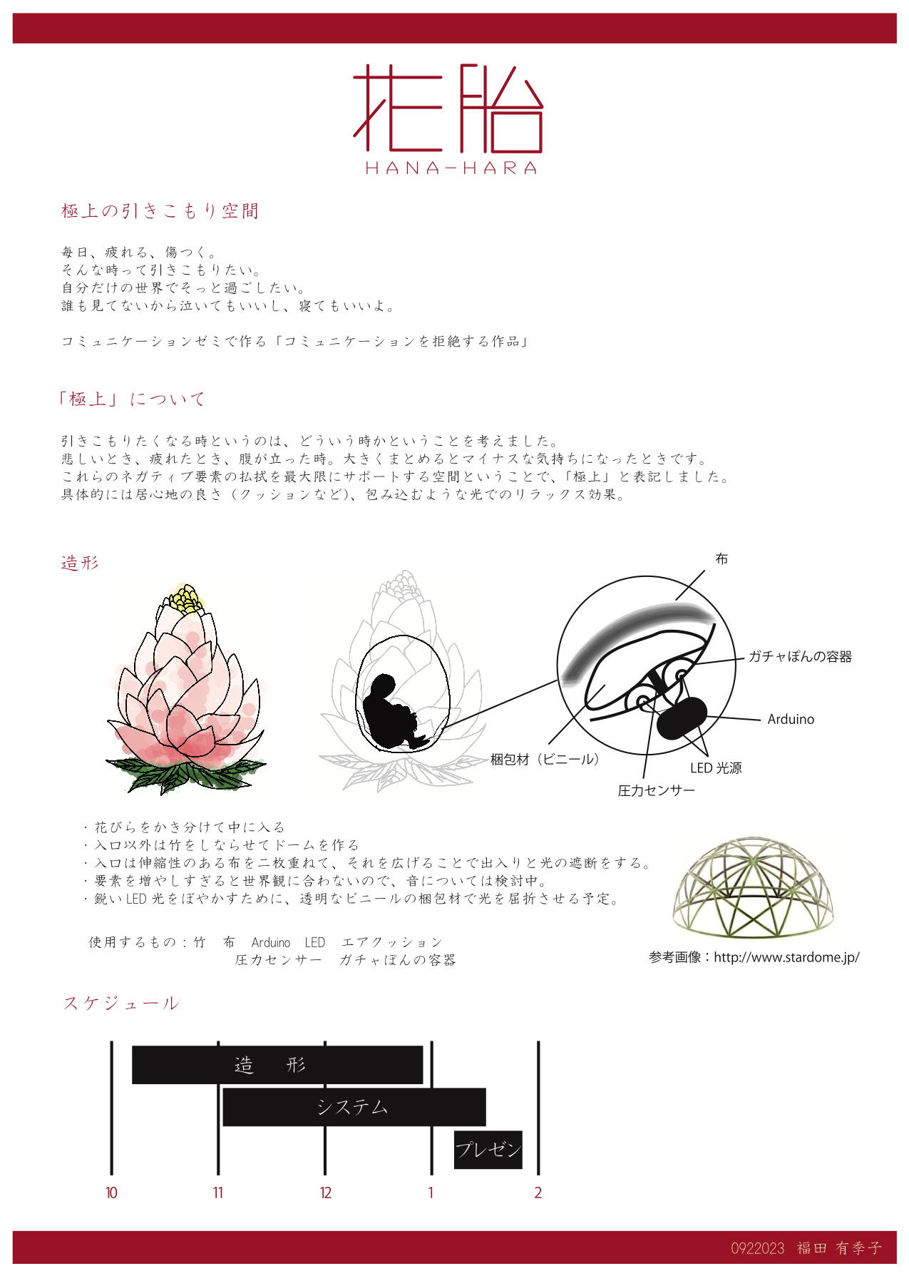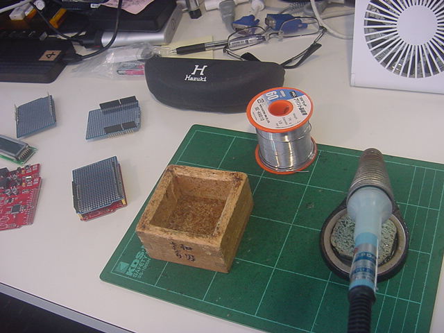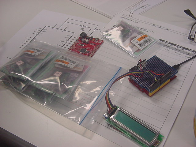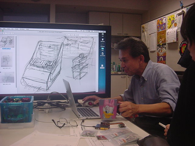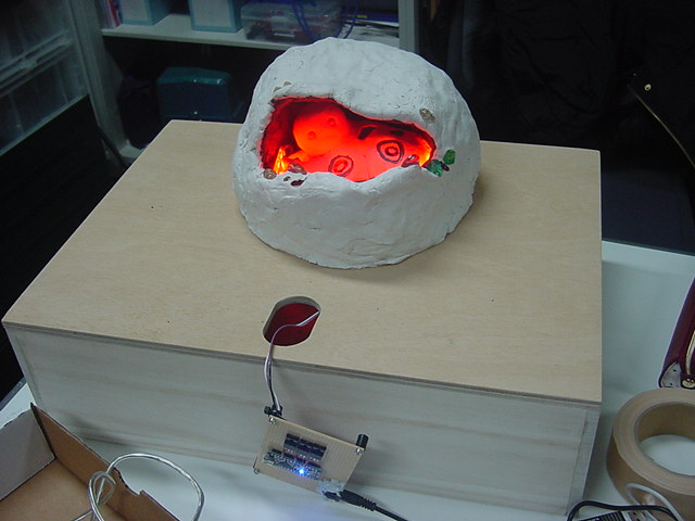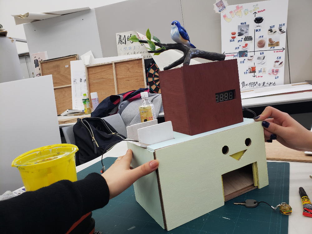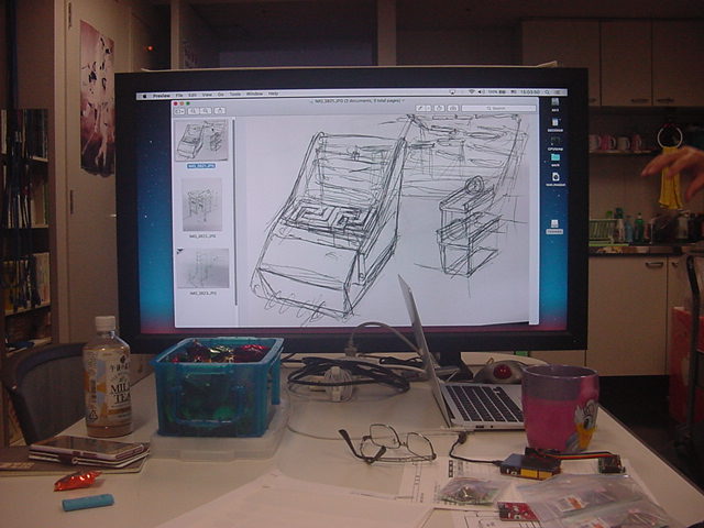そんな中、「インタラクティブプロダクト演習」の2回生・永井さんからは、明日のサポートのやりとりの合間に、上のような、なかなかジワジワ来る造形の途中経過の写真が届いた。 たんなる洞窟がこちらの声を変容して返すだけでなく、その前にこの子が横たわっている・・・というのは、さすがのデザインセンスである。 LED表現パターンを実装するMaxプログラミングを一緒に進める明日が楽しみになってきた。 そしてゼミに続く昼休みから午後には、 このように 1回生の山本さんのシステムを一気にハンダ付けからArduinoプログラミングまで快調に終えてしまった。 造形も進んでいる作品なので、仕上がりが楽しみである。