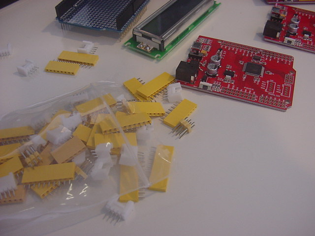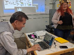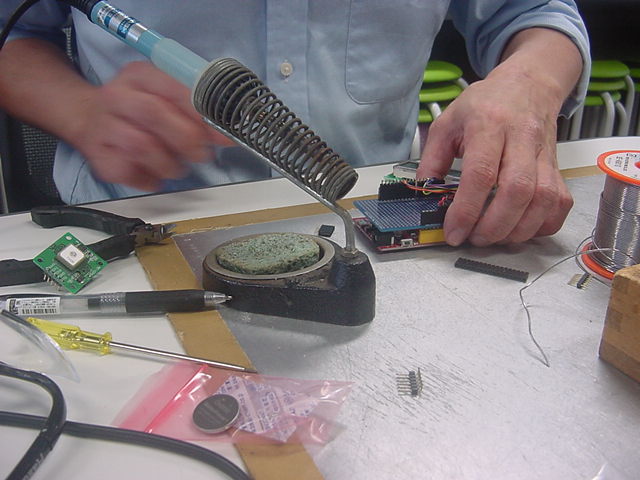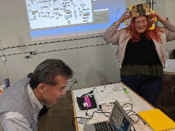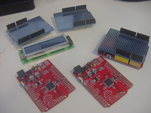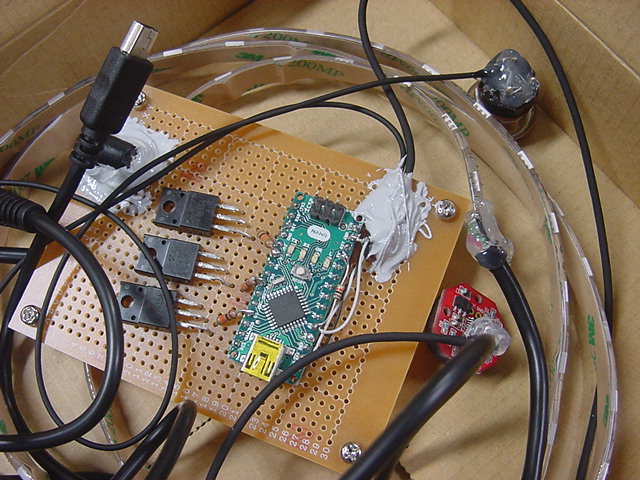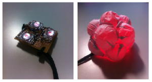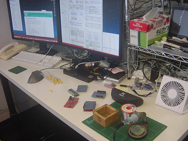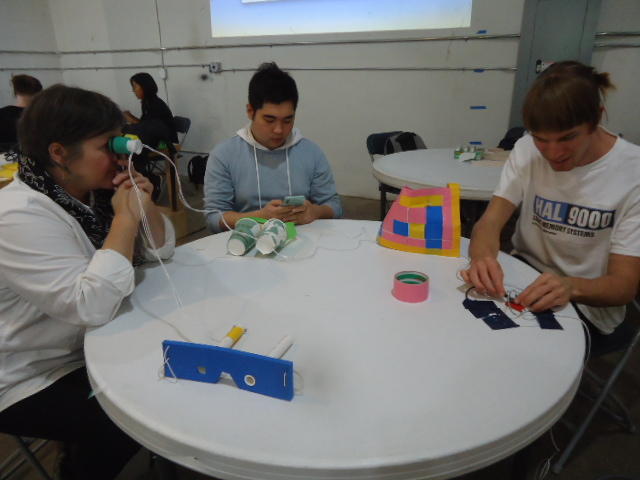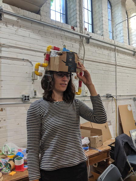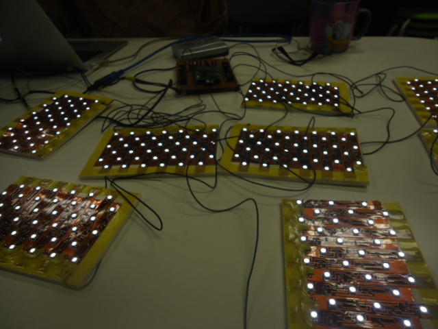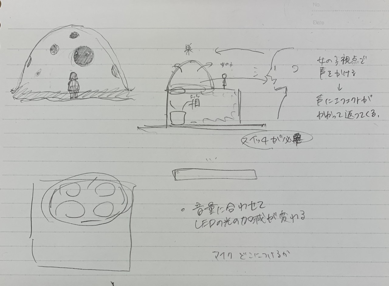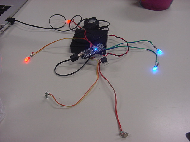 そんな中、「インタラクティブプロダクト演習」の2回生・永井さんからは、明日のサポートのやりとりの合間に、上のような、なかなかジワジワ来る造形の途中経過の写真が届いた。 たんなる洞窟がこちらの声を変容して返すだけでなく、その前にこの子が横たわっている・・・というのは、さすがのデザインセンスである。 LED表現パターンを実装するMaxプログラミングを一緒に進める明日が楽しみになってきた。 そしてゼミに続く昼休みから午後には、 このように 1回生の山本さんのシステムを一気にハンダ付けからArduinoプログラミングまで快調に終えてしまった。 造形も進んでいる作品なので、仕上がりが楽しみである。