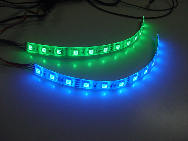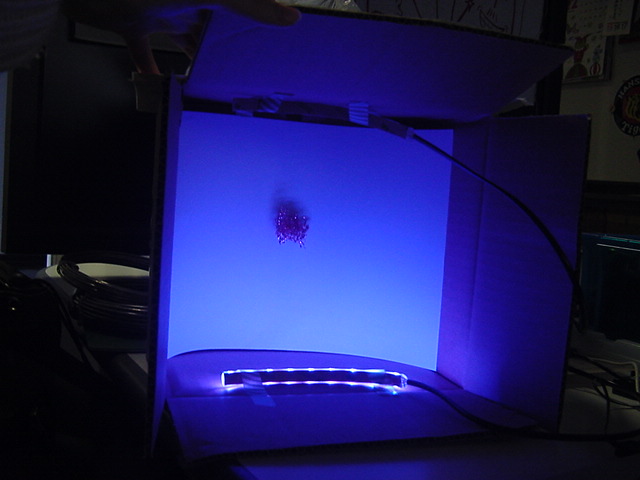 int buttonState = 0; int R_value = 0; int G_value = 0; int B_value = 0; int R_phase = 0; int G_phase = 0; int B_phase = 0; int R_step[] = {3, 30, 15, 45, 6, 15, 30, 4, 39, 9}; int R_sel = 0; int counter = 0; void setup() { pinMode(2, INPUT); pinMode(3, OUTPUT); pinMode(5, OUTPUT); pinMode(6, OUTPUT); analogWrite(3, 255); analogWrite(5, 255); analogWrite(6, 255); } void loop() { buttonState = digitalRead(2); if (buttonState == HIGH) { metamorphase1(); metamorphase2(); analogWrite(3, 255-(R_value/2)); if( (255-R_value/2) > 200) { analogWrite(5, 255); } else { analogWrite(5, 255-(G_value/6)); } } else { analogWrite(3, map(analogRead(A0), 0, 1023, 255,0)); analogWrite(5, map(analogRead(A1), 0, 1023, 255,0)); analogWrite(6, map(analogRead(A2), 0, 1023, 255,0)); } delay(3); } void metamorphase1() { if (R_phase == 0) { R_value += R_step[R_sel]; if (R_value > 255){ R_value = 255; R_phase = 1; R_sel = (R_sel+1) % 10; } } else { R_value -= R_step[R_sel]; if (R_value < 0){ R_value = 0; R_phase = 0; } } } void metamorphase2() { counter = (counter+1)%5; if (counter == 0){ if (G_phase == 0) { G_value += 1; if (G_value > 255){ G_value = 255; G_phase = 1; } } else { G_value -= 1; if (G_value < 0){ G_value = 0; G_phase = 0; } } } }このシステムでは、基板の裏にスライドスイッチがあって、これを切り替えると青く光ったのが謎だったが、基板上の3つの半固定ボリュームの値を表示してテストできるようにしたものだ、と簡単に判明した。 ちょうど去年末から、学生のArduinoシステムで「Firmata+maxuino」でやっていた光加減のテストであるが、Firmataもmaxuinoも出現していない当時は、このようにアナログ併用でやっていたのだ。