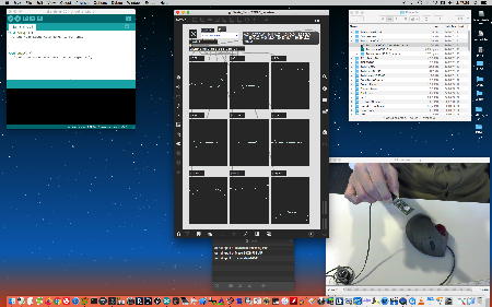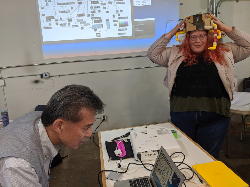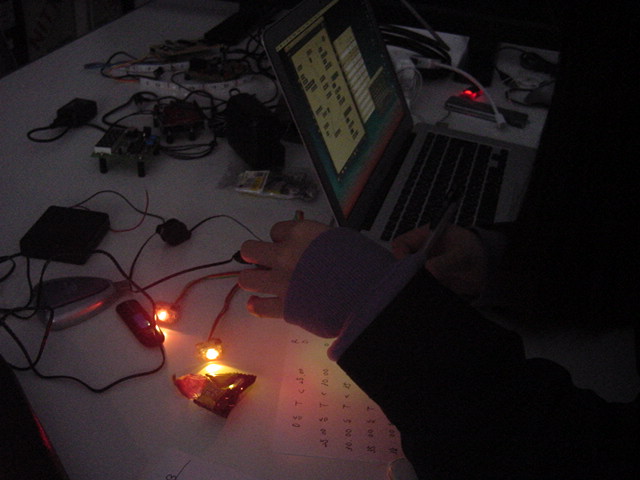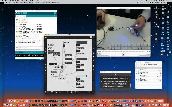 そして、午前にはゼミの田口さんのアポがあって、 このように なんとか片目半田づけでちょっとした対応をとり、さらにMaxのfullscreen化によって作品が無事、完成した。 これはなかなか素晴らしいものになったので、MDWスケッチング・ワークショップでも参加者に紹介してみたい。 その後、常に遅い的場先生から、ようやく MDWチラシの原稿 というのが届いたが(^_^;)、もう当日まであと3日しかない。 こんなのでチラシの役目があるのか、いつもの事ながらやや不明である。
