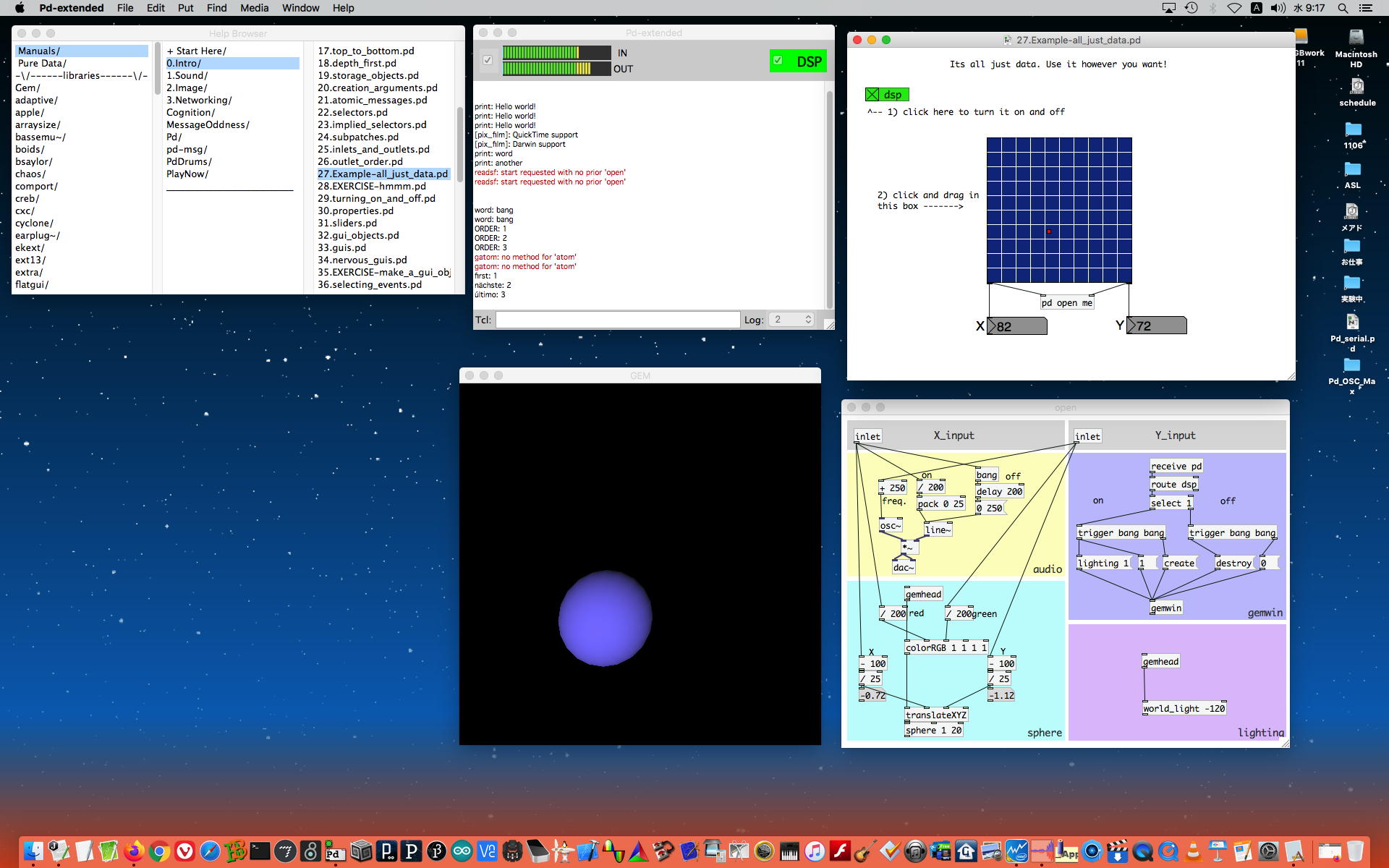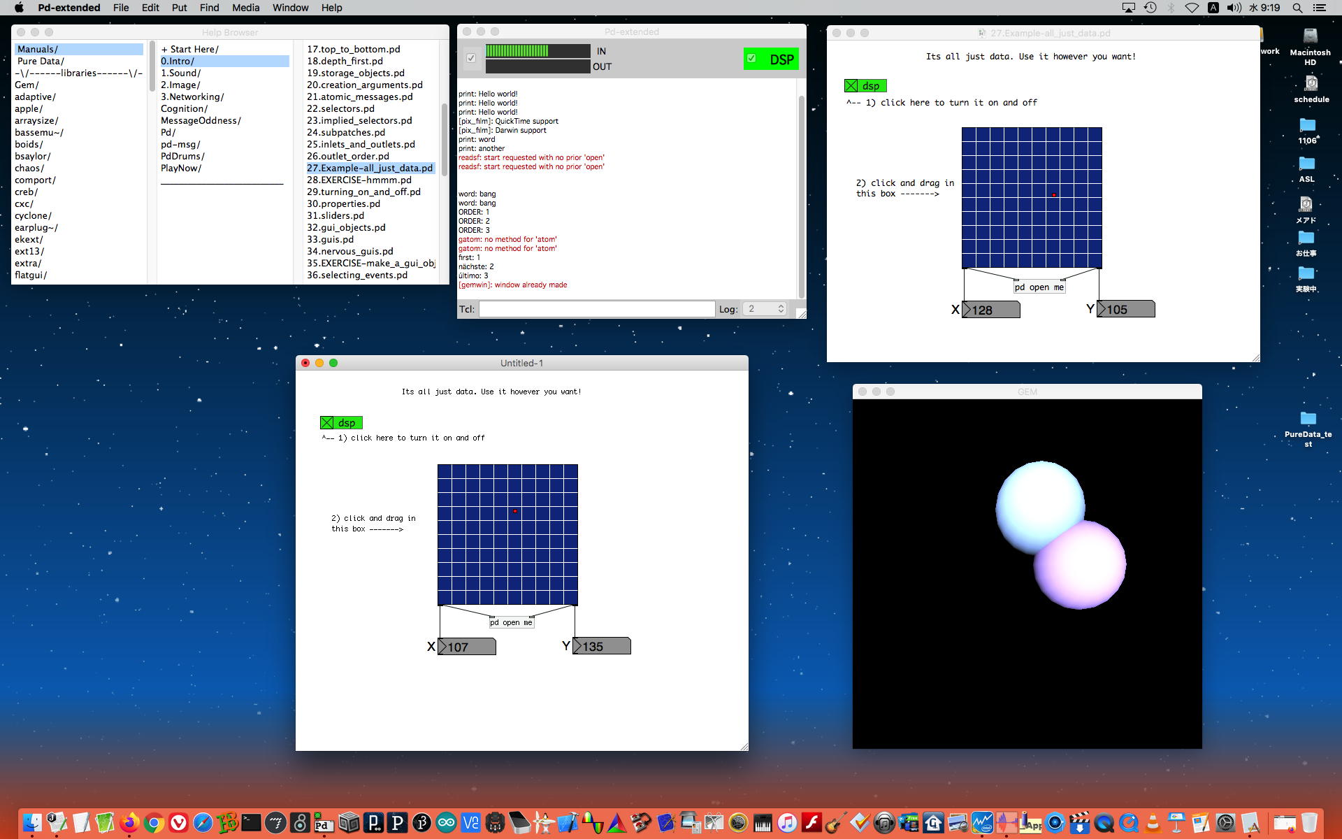 そういうわけで、4年ぶりのSketching in Hardware(デトロイト)に向かう出張の初日、セントレアの東横インである。 今日は朝に研究室のワックス清掃、2限に某練習などをこなしつつ、その合間にPureDataのexamplesの全貌を調べているうちに、なんとなく編集して走らせるというループが快調に回るようになった。