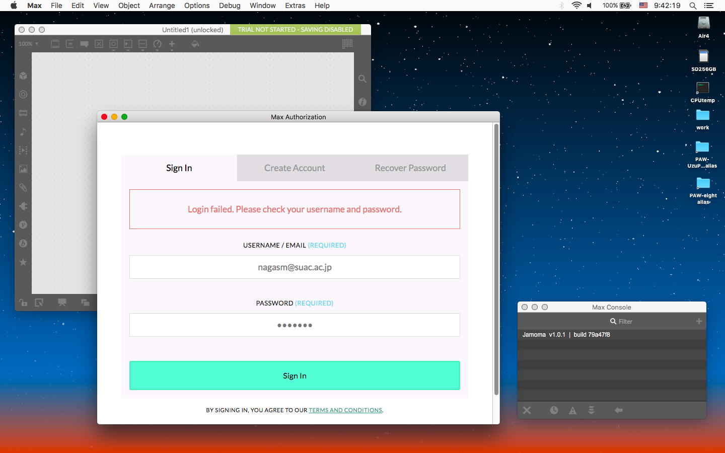困ってCycling'74のスタッフにメイルすると、「 Hi Yoichi, You can reset your password at cycling74.com. Click on Sign-in/Create Account, then the Forgot Password link.」と来たのだが、何度やっても、Cycling'74のアカウントはOKなのに、どうしてもそこで変更したパスワードがMax8では「違う」と叱られるのである(^_^;)。 まぁ、Max7とMax8はパッチに互換性があり、Sketchingに持参するデモはライセンスの無いMax8でも走る(編集→保存は出来ない)ので、とりあえず切実な問題ではないものの、どうも気分が悪いのだ。