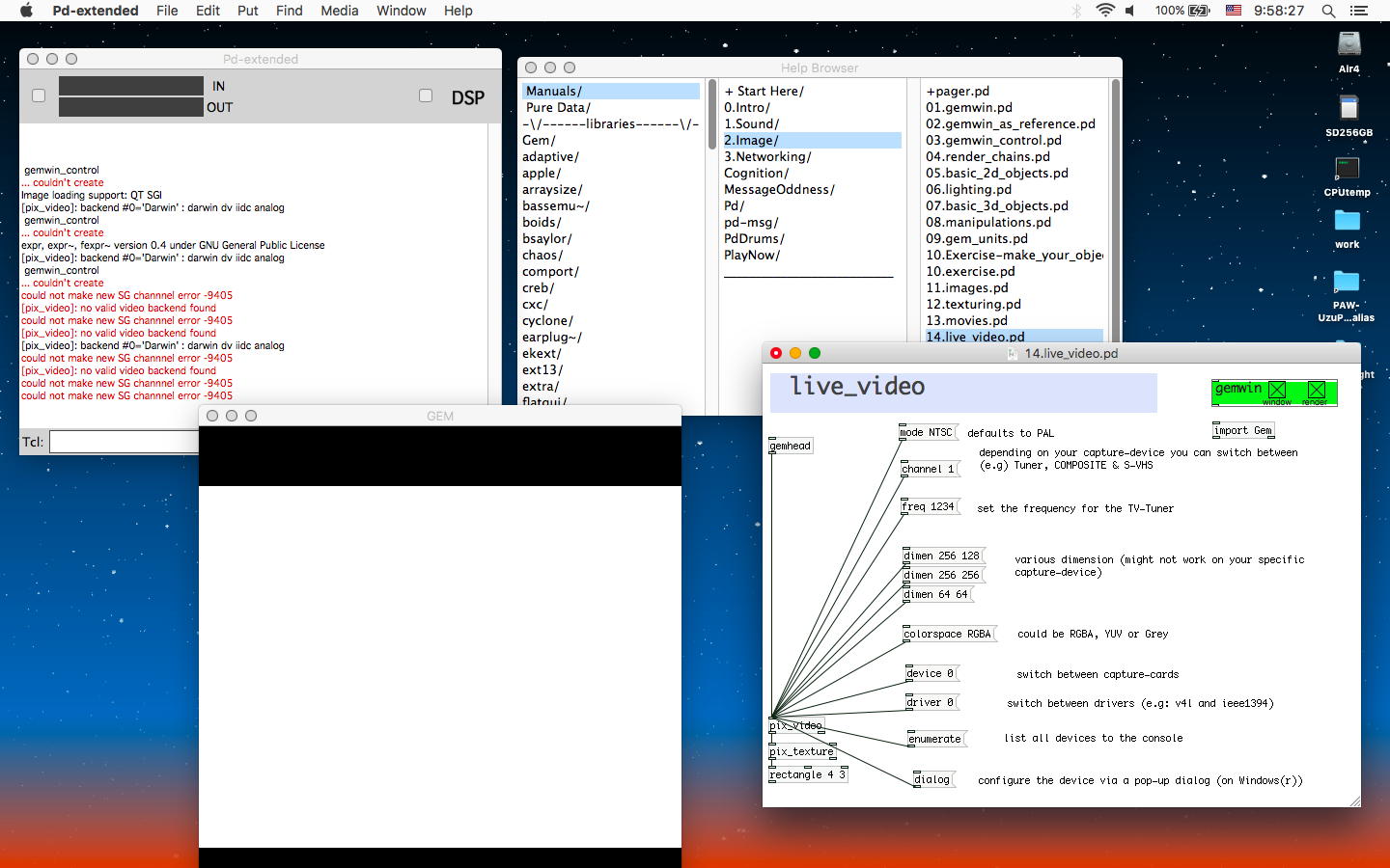 そして、昨日は研究室のお仕事Mac mini(USBカメラ外付)で快調に動いていたPureDataのパッチが、上のように、このMacBookAirではライヴカメラがうまく動いてくれない・・・と判明した(^_^;)。 こうなると、お仕事MacとこのMacBookAirとの違いなどの些事に翻弄されそうで、ちょっとあまり深入りできない可能性が浮上してきた。 あと30分でワシントンD.C.行きのフライトに搭乗するところであり、まぁ、こんなところまでを出国時レポートとしておこう。
