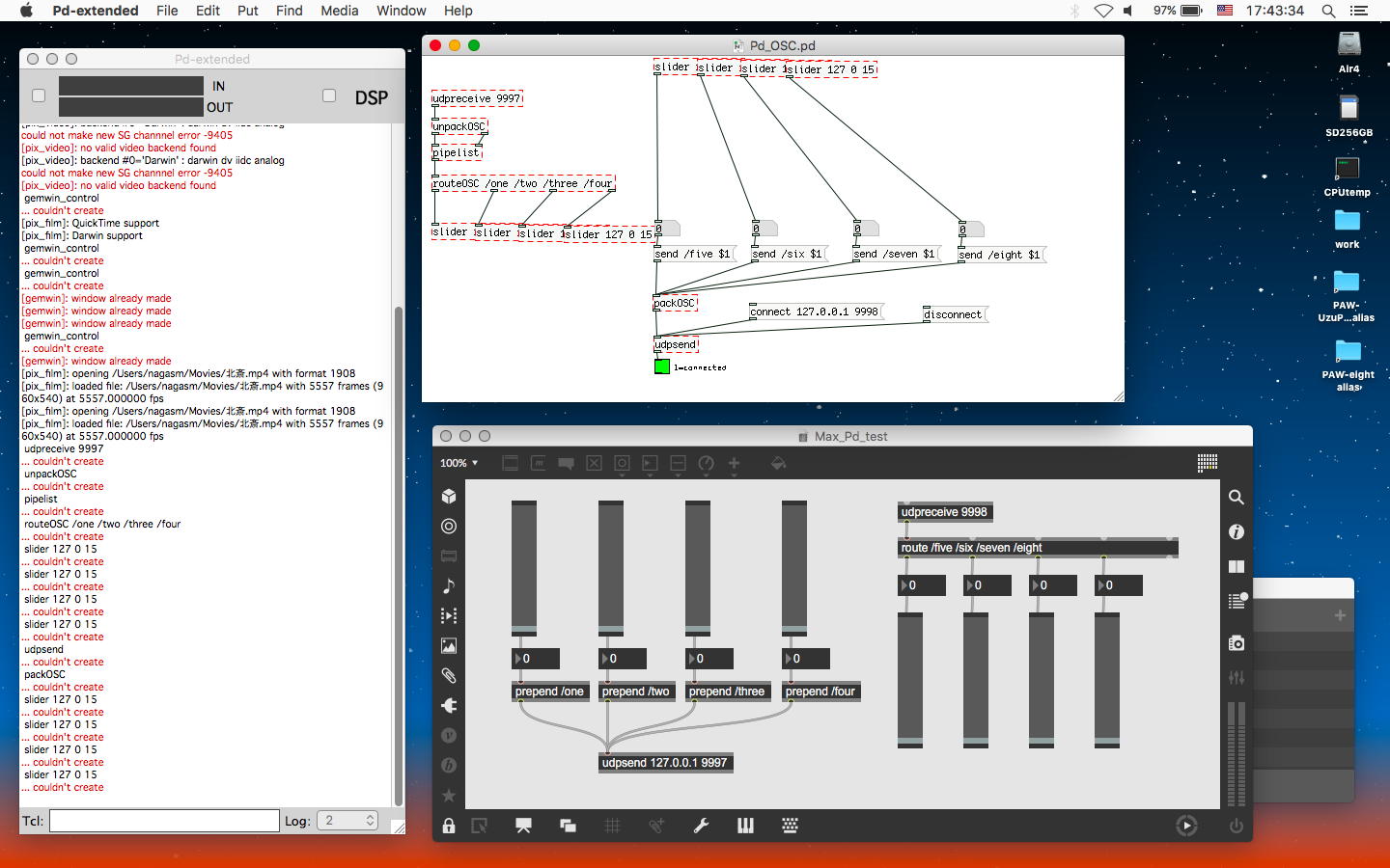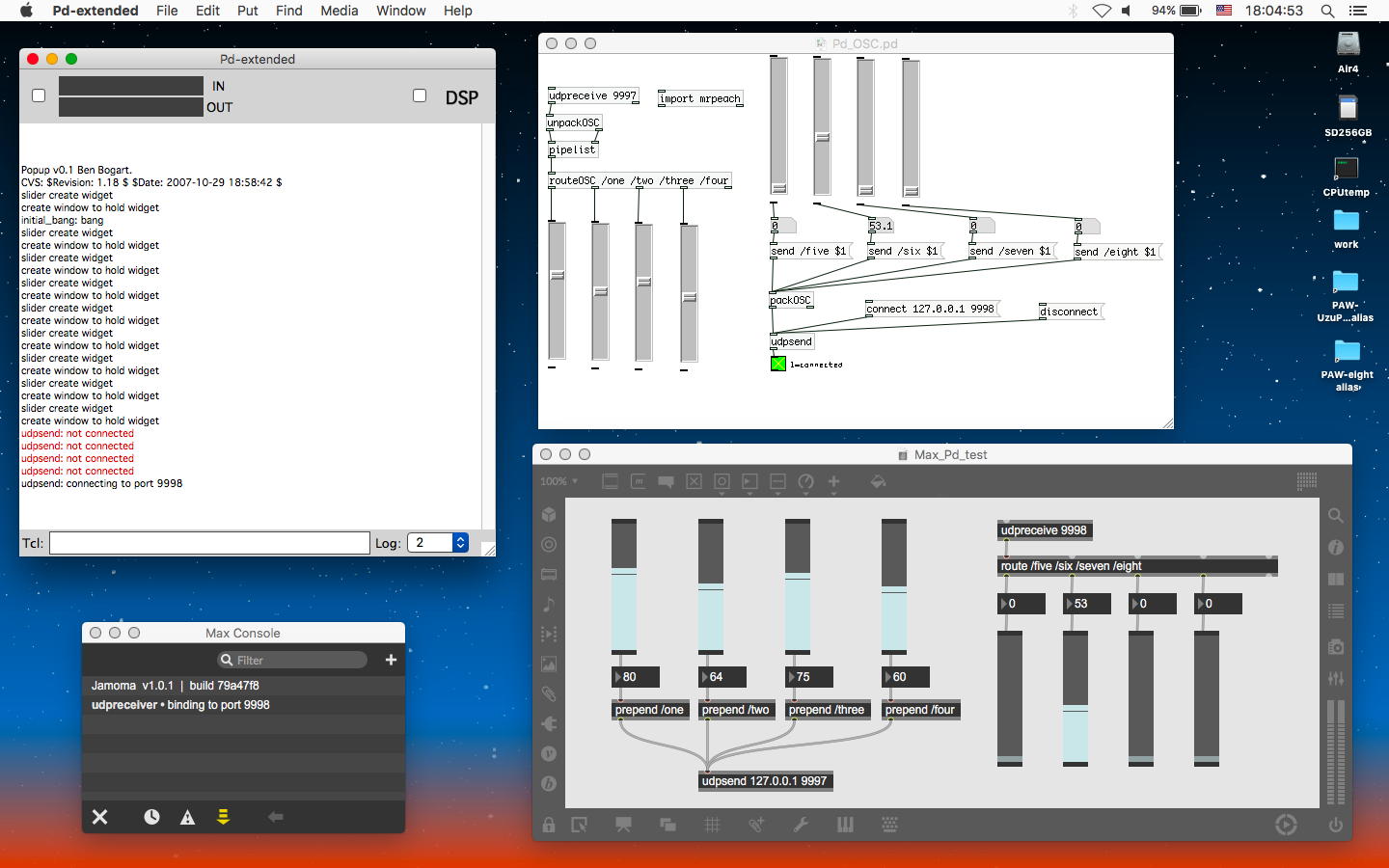 ところがお替りのコーヒーとともに往生際悪く試行錯誤していると、なんと上のように、ほとんど全てのオブジェクトが全滅していた筈のPureDataバッチが正常に蘇って、ちゃんとMax8パッチとOSCで双方向に通信できるようになった。 こんな感じ である。 なんともPureDataは気紛れだが、どうやらHelp Browserでdefaultの場所にあるサンプルを呼び出してやるのが「おまじない」らしい。 こういう経験則が色々あるとなると、なかなか厄介かもしれないが、まぁ「お試し」実験が楽しいというのも醍醐味なのだ。