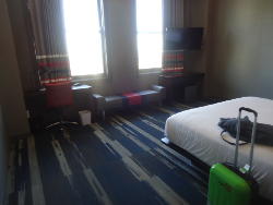 ・・・そして遂に、デトロイトのダウンタウンの中心部にある、Marriot系列の豪華なホテル"ALOFT DETROIT at the david whitney building"に到着した。 午後3時半過ぎにとりあえずシャワーを浴びたが、身体の奥底の日本時間は早朝4時半であり、油断すると寝落ちしそうだ(^_^;)。 なんとも巨大な部屋で、窓の真ん前には古風な教会、さらに隣には野球場、そしてFORD FIELDというスポーツ施設が徒歩圏内に目白押しである。 とりあえず今夜はopeningの有志パーティがあるらしいので、ここまでをWebに上げて、ぼちぼち待機することにしよう。
