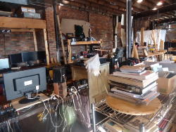 そして夕方6時(日本では既に翌日の朝7時)のちょっと前にロビーに行ってみると、まず間違いなくSketchingであろう3人を発見して声をかけて、一緒のタクシーで「evening pre-summit gathering at OmniCorp Detroit」に行ったのだが、これがまず、素晴らしく凄いところだった。 Sketchingのメンバーの一人がDetroitでやっている「根城」なのだそうで、2枚だけ上に置いて全ての写真は後日レポートに上げるが、いくら見ていても飽きない。 しかしここで、機内で4時間ほどしか寝ていないのに加えて「ほぼ地球の裏側の時差」からくる強烈なJet Lugを痛感して、Mikeに頼んでタクシーを呼んでもらってホテルに帰ってきた。 そして「寝よう!!」とベッドに入ったものの、19時から24時まで5時間、粘ったものの、まったく眠れなかった。 まぁ当然で、身体の日本時間は朝の8時から午後1時までなのだから、いくら睡眠不足でも寝られないのだった。