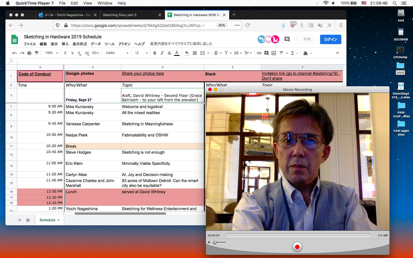 そして、ようやく翌日の朝である。 いくら日本(身体時間)が昼間であるといっても、セントレアでも成田→ワシントンの機内でもそれぞれ4時間ずつ程度の寝不足が続いていたので、なんとか朝4時半に目覚めるまでに、またまた4時間程度は眠れたようである。 シャワーとコーヒーで目覚めてMacを見てみると、こちらは深夜でも日本は金曜日の午後ということで、新学期に関係したSUACからのお仕事メイルなどが10数本も届いていた。 この調子では「一時保管フォルダ」に入れておくだけでは帰国後に整理作業に死ぬ・・・と判断して、一念発起、USBメモリで持参してきた「お仕事」フォルダと「nagasm.org」フォルダのbackupから手元に「差分フォルダ」を作って、全てを出張先で処理してしまう体制を整えた。 5ちゃんねるは海外からはアクセス出来なくなったので、ヘッドラインを見るしか出来ず、お仕事が捗ることも確認した。オンラインのスケジュール表を見てみると、 Sketching日記(2) の「2019年9月18日(水)」で、コピペの連続作業で完成していた テキスト版スケジュール から、あちこち変更があった。 苦労して元のversionを作っていたので、コーヒーとともに変更点だけコピペ作業して上のように整理できたが、今夜のディナーに向かうバスのクーポンコードは書かれているのに、明日からの部分は空白なので、まだまだ「進めつつ変更していく」といういつものパターンのようだ。●2019.09.27(金) 08:30 AM #BREAKFAST 09:00 AM Mike Kuniavsky Welcome and logistics! 09:20 AM Mike Kuniavsky All the mixed realities 09:40 AM Vanessa Carpenter Sketching in Meaningfulness 10:00 AM Nadya Peek Fabricatability and OSHW 10:20 AM #Break 10:40 AM Steve Hodges Sketching is not enough 11:00 AM Eric Klein Minimally Viable Specificity 11:20 AM Carlyn Maw AI, Joy and Decision-making 11:40 AM Cezanne Charles and John Marshall 83 acres of Midtown Detroit: Can the smart city also be equitable? 12:00 PM #Lunch 01:00 PM Yoichi Nagashima Sketching for Wellness Entertainment and Rehabilitation 01:20 PM Wendy Ju Neural Nets for Music 01:40 PM Jeevak Badve Design for an "Emotional" response 02:00 PM Carla Diana with Michael Candy, Steve Kuypers, Sijie Li, Zhuo Chen, Caroline DelGiudice, Cody Norman Introducing Cranbrook's 4D design program 02:20 PM #Break 02:40 PM Gabriella Levine Building hardware-supported AI systems from sketch to scale 03:00 PM Kevin Andersen Sketching with LEGO hardware 03:20 PM Kipp Bradford The death of the (modern American) Maker movement 03:40 PM Paloma Fautley IoT communication solutions to get their projects to communicate with the world 04:00 PM Julien Vanier Mentoring in Hardware 04:20 PM #Break 04:40 PM Jules Fennis and Linus Persson Designing Haptic Experiences 05:00 PM Kristen Gallerneaux "They Were There When the Noise Started" multimedia performance-lecture 06:00 PM #Ground transportation to dinner 06:30 PM #Dinner 08:00 PM #Ground transportation back to Aloft ●2019.09.28(土) 08:30 AM #BREAKFAST 09:00 AM Josh Walton Mixed Reality Hardware 09:20 AM Melissa Daniels You're a masterpiece 09:40 AM Jeff Sturges Money Laundering 10:00 AM Jason Kridner Eliminating software development for wireless IoT sensors/actuators 10:20 AM #Break 10:40 AM Joselyn McDonald Femme-Tech: Gender-Inclusivity and Technology 11:00 AM Justin Bakse Mapping Project Based Learning 11:20 AM Amon Millner Opening Doors to Code and through Code: microBlocks and Unruly Splats 11:40 AM Leah Buechley Computational Ceramics 12:00 PM #Lunch 01:00 PM Ayodamola Okunseinde Slime mold tech 01:20 PM Shamus Grubb Radical Illegibility 01:40 PM Dan Radomski DFX, our unique approach to help hardware companies be successful 02:00 PM Saturday adventures 05:40 PM #Ground transportation to dinner 06:00 PM #Dinner 08:30 PM #Ground transportation back to Aloft ●2019.09.29(日) 08:30 AM #BREAKFAST 09:00 AM Laura Davendorf Crafting (Smart) Textiles / Future Frustrations 09:20 AM Evan Strasnick Circuit Design Tools for Exploratory Understanding 09:40 AM Bjoern Hartmann Remote Debugging of Breadboard Circuits 10:00 AM Sophia Brueckner Romance novels and bowerbirds 10:20 AM #Break 10:40 AM Matt Biddulph Sensing identity 11:00 AM Aleksandar Bradic Human-Data Interaction: A case for hardware-driven innovation 11:20 AM Harry Souders Building Creative Technology Installations 11:40 AM David Cuartielles Learning, for a change - Balloons, rockets, and other things in Spanish 12:00 PM #Lunch 01:00 PM Debera Johnson Systems-based design 01:20 PM Tod Kurt Anthropological differences across users of a common hardware device: blink(1)'s many APIs 01:40 PM Nik Martelaro What could go wrong?: Promoting conversation about failure modes during early product design 02:00 PM Pierluigi Della Rosa Wireless microcontrollers for prototyping 02:20 PM Paula Te and Joshua Horowitz Dynamicland 02:40 PM #Break 03:00 PM Aaron Blendowski a house to live in 03:20 PM Anita Wilhelm mixed reality prototypes; inclusive games 03:40 PM Alasdair Allan and Tom Igoe Between Two Ferns, Machine Learning and Security edition, with other things too. 05:00 PM Concluding discussion This year's format: 2 minute questions/comments and 5 minute answers/responses you've been dying to ask presenters, or responses to constructive criticism. Crit rules: start with something positive, clarify ambiguity, avoid universals/absolutes, speak from your perspective 05:40 PM Science Fair setup 05:50 PM Science Fair 06:50 PM #Attendees on their own for dinner ●2019.09.30(月) 07:30 AM #BREAKFAST 07:30 AM Ground transportation to Cranbrook (leaves Aloft at 8:15 SHARP!) 09:00 AM Mike Kuniavsky Welcome and logistics! (part deux) 09:20 AM Walking tour through the campus? C