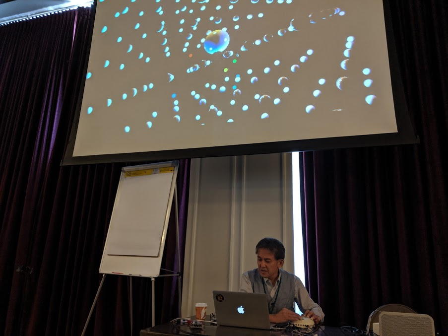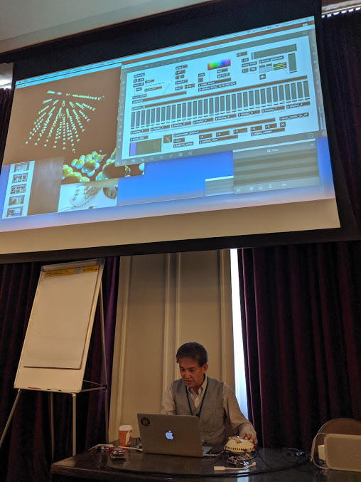 そして3日目のセッションがスタートしたが、どうも身体が重いのが気になる。 タイトルの通り、テキスタイルデザインをコンピュータ化するというもので、コンセプトとしては「アートをアミューズメントに」という事のようだが、テキスタイルに限らず色々な素材で「造形」していた。 自然の「音」データからテキスタイルのパターンに変換するアイデアは面白い。 この人は完全にアーティストだった。 Slackから届いた資料は これ とか これ とか これ である。09:20 AM Evan Strasnick Circuit Design Tools for Exploratory Understanding