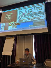 なんだか謎の映像とともになんだか謎のポエムを朗読するというなんだか謎のパフォーマンスだった。 テクニカルタームが無いので、このリスニングはほぼ無理である(;_;)。 その合間に、誰かがアップロードサイトに上げてくれた僕のプレゼンの写真を見つけたのでさっそくダウンロードして以下のように置いた。