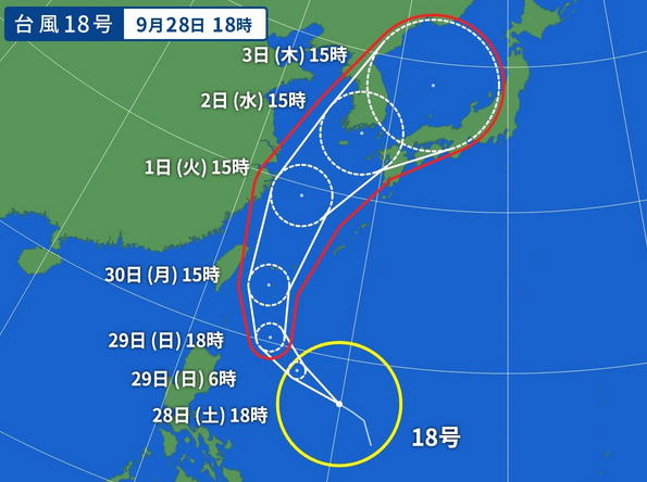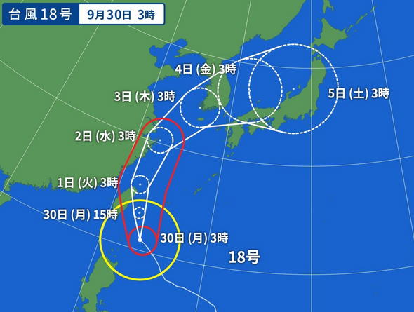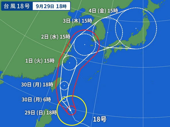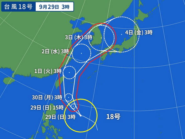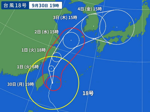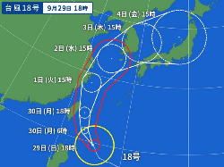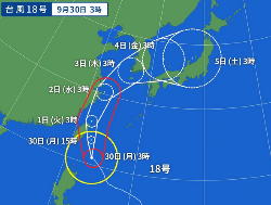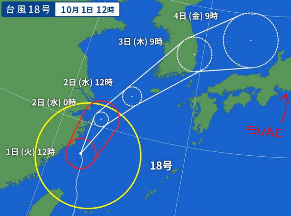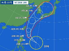 台風18号の予想進路は上のように、朝の時点よりもだいぶスピードが落ちてきたようで、これなら帰国のフライトには全く問題がなさそうで、まずはホッとした。(^_^)