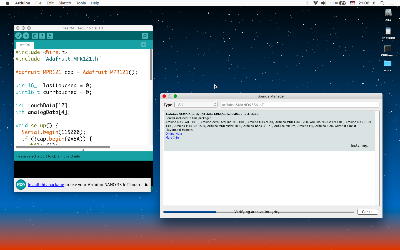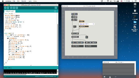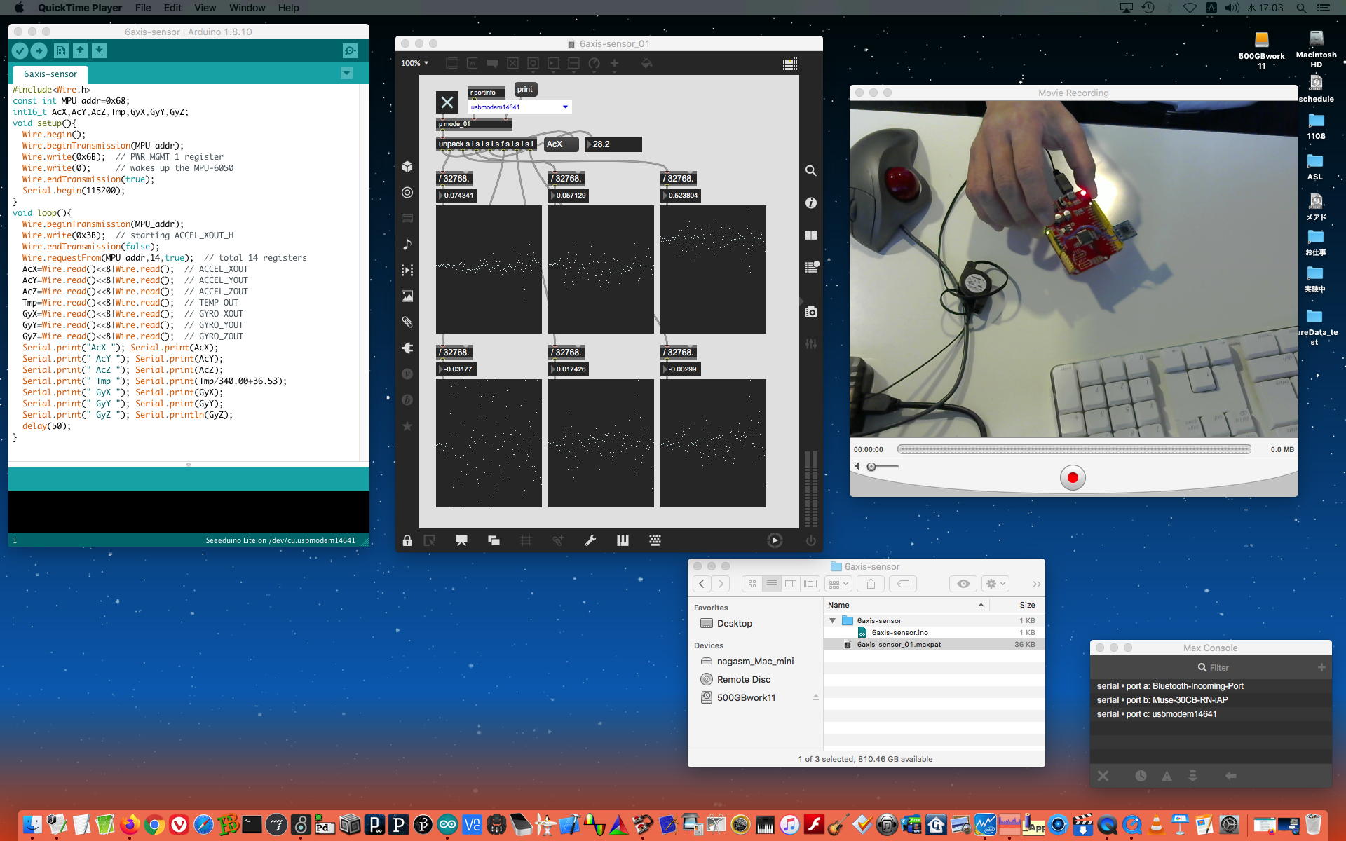 そして午前中には田口さんが1106でMaxプログラミングに精を出している横で、僕も新たな展開に挑戦してみた。 これまで、ArduinoNano33IoTとArduinoNano33BLEについては、どうしてもWiFi機能とBluetooth機能が動いてくれていないのだが、気付いてみれば、無線だけでなくこれらの上には立派な6軸/9軸センサが搭載されている事を思い出したのである。 そこでさっそく、Arduinoのサイトで このページ を起点として実験してみると、なんとアッサリと15分ほどで、以下のような簡単なArduinoスケッチとMaxパッチによって、毎秒50サンプル、115200通信の立派な6軸センサが完成してしまった。 これはなかなかの進展であり、USBで接続しているものの、「Seeeduino+6軸センサ」よりも格段に簡単で、さらに見たところではセンシングデータもいい感じになっている。 これは2月のワークショップで大々的に活用できる新たなネタとなった。(^o^)