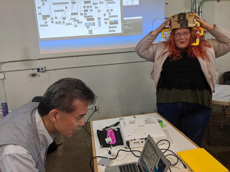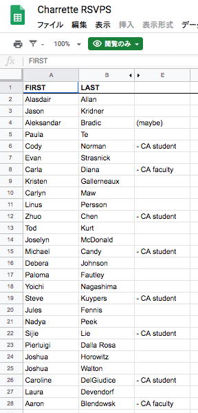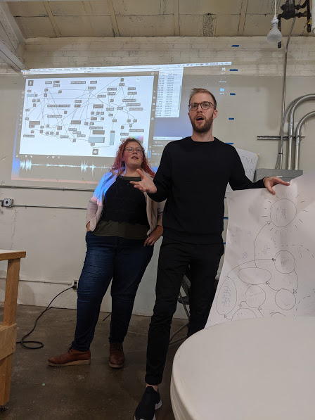 教えているデザイン学校の紹介という感じで、前半のスライドはほぼ文字だけなのでいまいち伝わってこなかったのが残念。 内容はプロジェクトベースで個人を伸ばすという、まぁよくあるスタイルのようだった。 コンセプトを整理するためにKJ法のように紙を張り出していくのだが、その白板には既にフローの矢印が描かれている(Action Mapというらしい)のがちょっと謎だった。 後半にそのAction Mapを拡大してくれたのでちょっと判ったのは、これは「デザイン手法の歴史/系統図」だったようで、自分はどのあたりに立ち位置を設定するか、そのプロジェクトはどの手法で攻めるか・・・などを紙で貼り出すらしい。 Slackから届いた資料は これ である。11:20 AM Amon Millner Opening Doors to Code and through Code: microBlocks and Unruly Splats