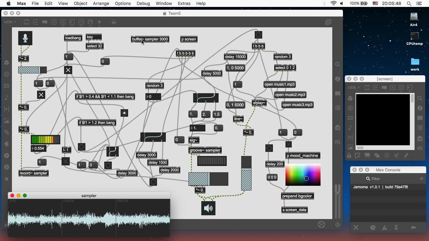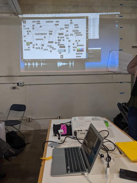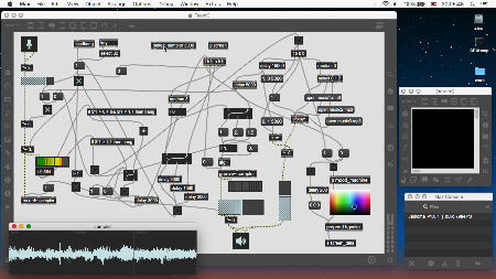 そして「インタラクティブプロダクト演習」では、永井さんの作品が このように 姿を現してきた。 せっかくなので、Maxサンプルに付いているゴージャスなreverbをちょっとだけ加えてみたが、ますます「洞窟」感が増した。 これでこの作品については、来週の発表プレゼンを待つばかりである。(^_^)