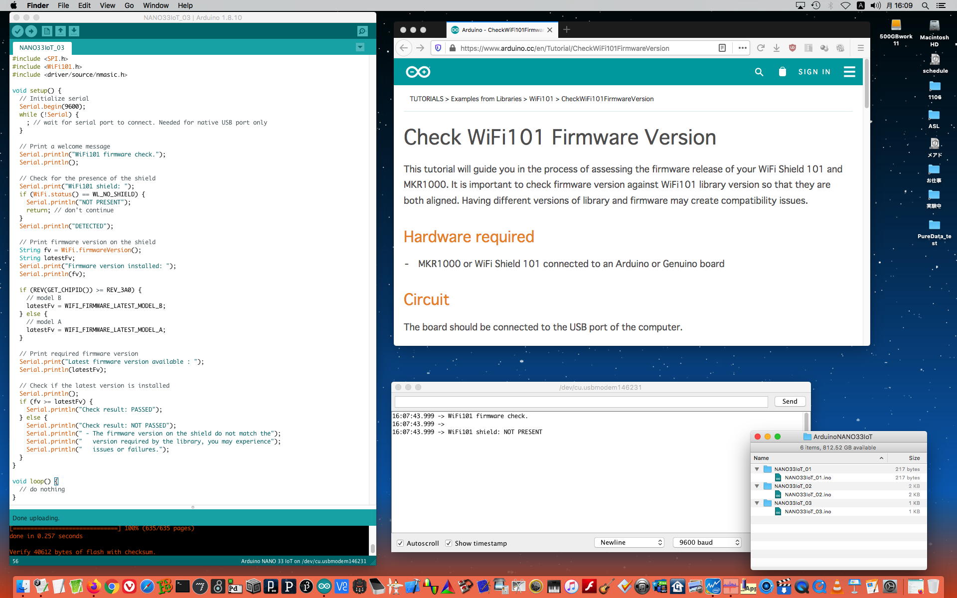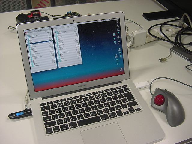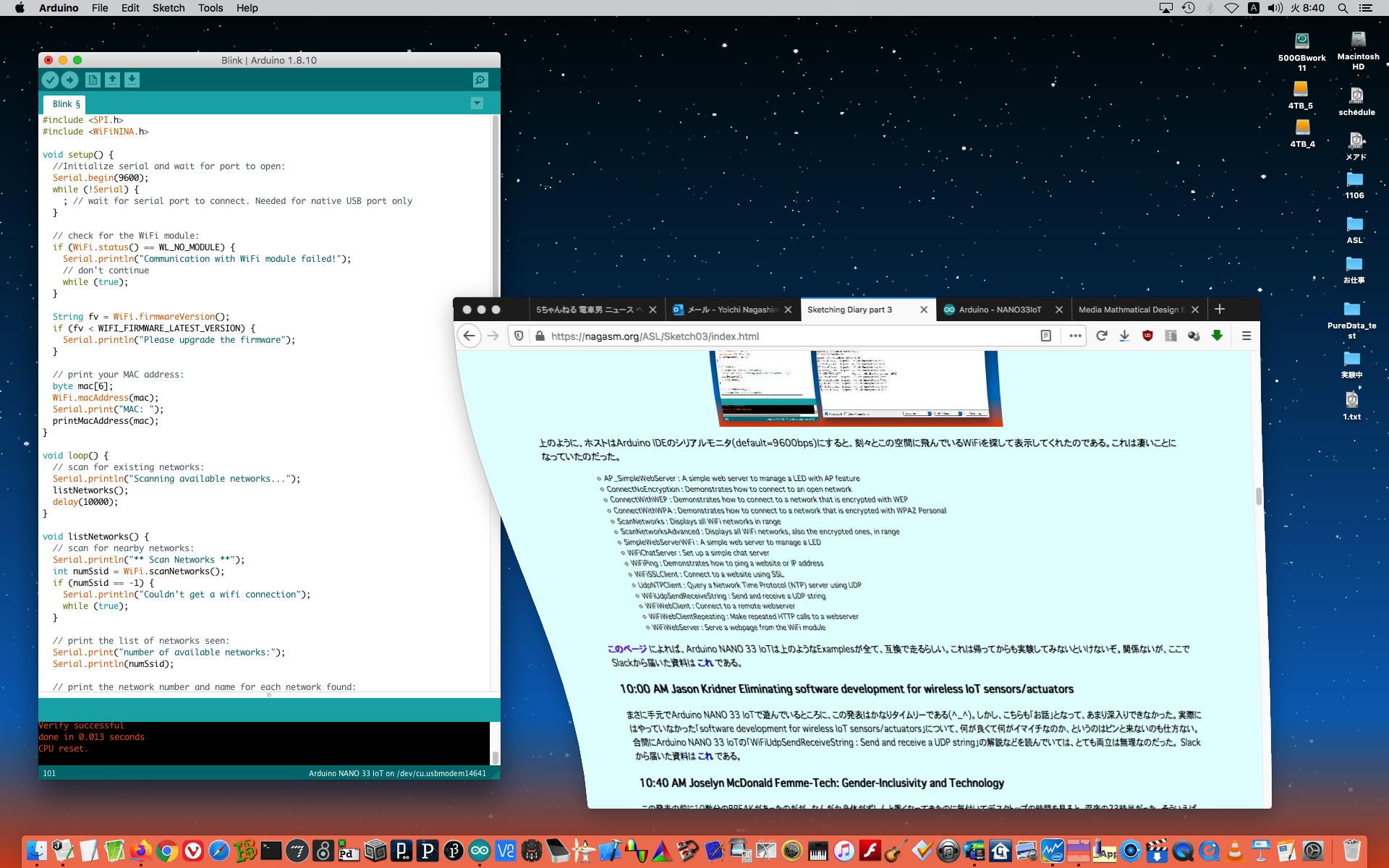 そして、「このパッケージをダウンロードしてインストールせよ」というリンクに従っていくと、ダウンロードは早かったものの、インストールはかなりの時間(数分)がかかった。 さすがにファームウェアの書き換えは慎重にやっているのだろう。 MacOSXではドライバの設定は不要というのもいい(^_^)。 そして、最初のBlinkプログラムの書き込みに成功したところで2階のSketching会場に向かった。