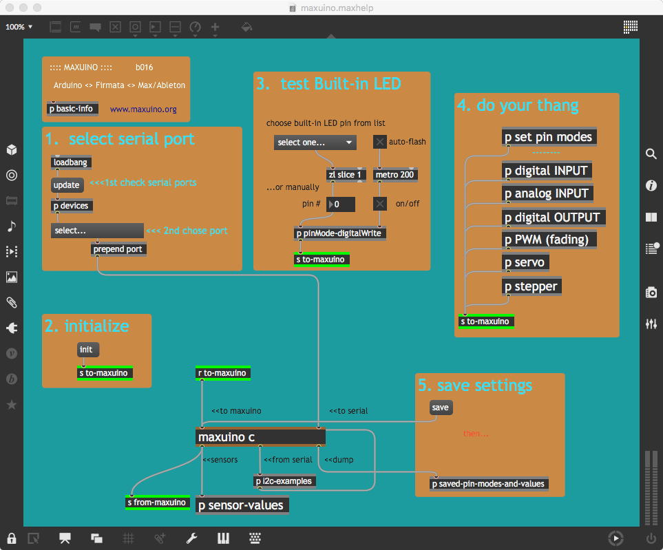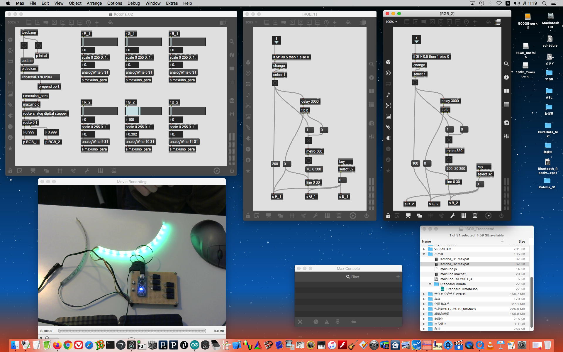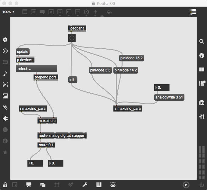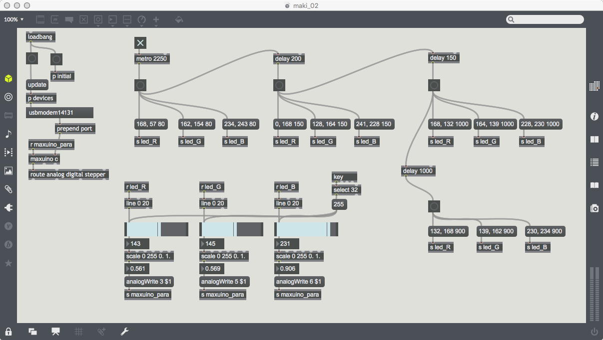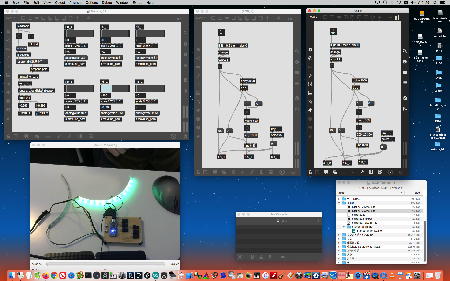 今週は月曜から金曜まで毎日欠かさずArduinoのプログラミングをしている気がする(^_^;)。 今朝も朝8時のアポで1回生・小澤さんがやってきて このように 進めた。 まず、かつて福田さん作品のために製作したRGB-LEDのArduinoにFirmataを書き込んで、maxuinoを含めたMax側からのパッチとして、1時間ほどかけて以下のように「演出」するように微調整を繰り返した。