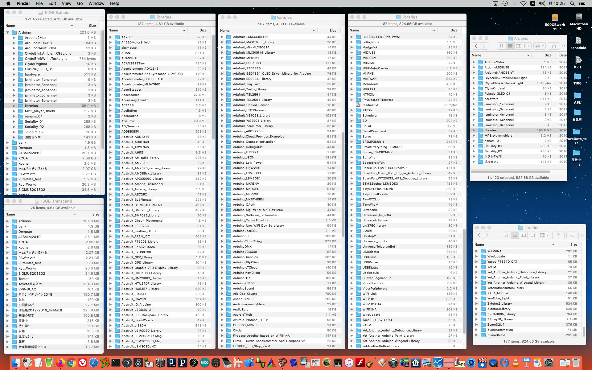 さらに、Arduinoディレクトリには、自分が作ったArduinoスケッチ群だけでなく、「libraries」というディレクトリがあり、これが4台のMacで大きな違いとなっている事も判明した。 これは、3台のMacノート、「MacBookAir3」・「MacBookAir4」・「MacBookAir5」はそれぞれ、学内で移動して使ったり、どれかを出張に持参するので、その出先でArduinoの内職とか実験とかをした際に、IDEが「新しいライブラリを入れますか?」と聞いてきた時にゲットしたものらしかった。