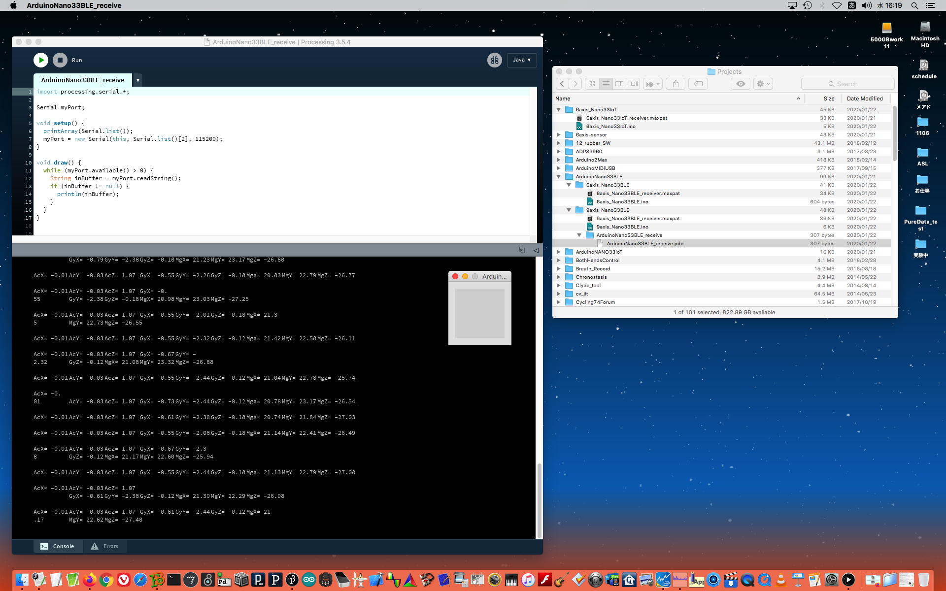 そして、4-5限アポの理子ちゃんが1106でサクサクとMaxプログラミングを進めている横で、再び「謎の現象」を追いかけたが、「Arduino IDEのシリアルモニタ」に加えて、以下のような「Processingのシリアル受信確認スケッチ」も、ArduinoNano33IoTでもArduinoNano33BLEでもUSBシリアルから刻々と送られてくるデータをきちんと受信できる事を確認した。 つまり、「Max8(Max7)だけ」が、ArduinoNano33IoTの情報はちゃんと受信しているのにArduinoNano33BLEの情報は受信できていないのである。(^_^;)