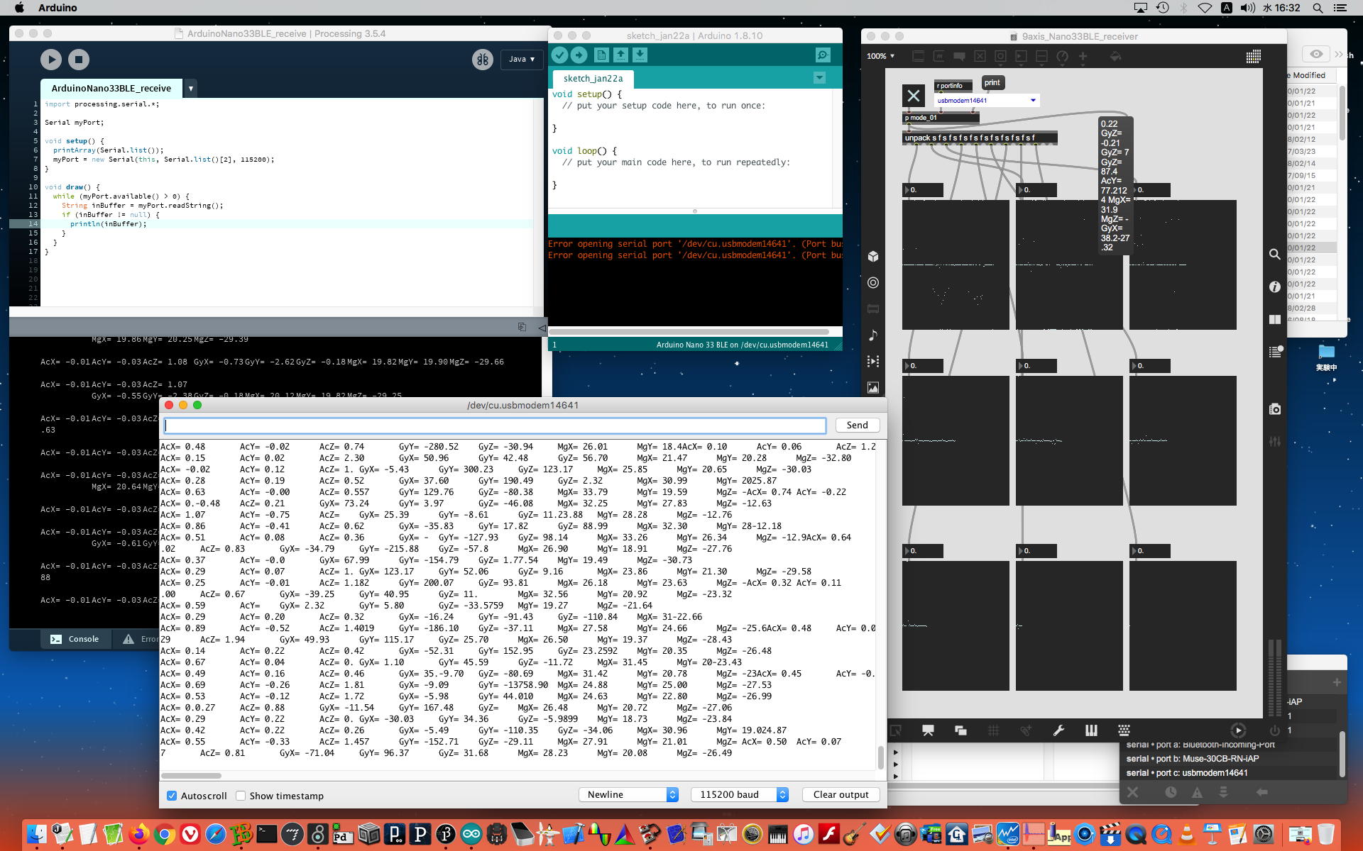 これは、「ArduinoIDEシリアルモニタがArduinoNano33BLEを掴んでいる時にMax8パッチが同じポート指定で見に行った」という時の状況で、なんとMax8はエラーを出さずに、切れ切れでデータを受け始めて、その時に同時にArduinoIDEシリアルモニタもところどころデータ落ちしつつ動作している、という、ありえない状況である。 そしてここでArduinoIDEシリアルモニタを終了してみると、Max8パッチは見事に9軸センサのデータをサクサクと受信してくれたのだった(シリアルパケットのサイズだけ78→120と増やすことで全データを確保できた)。 つまりは、ArduinoIDEかMax8かOSのどこかに何らかのバグがあり、シリアルポートを奪い取ることが可能な、まさに「混線」しているような状況なのだ。