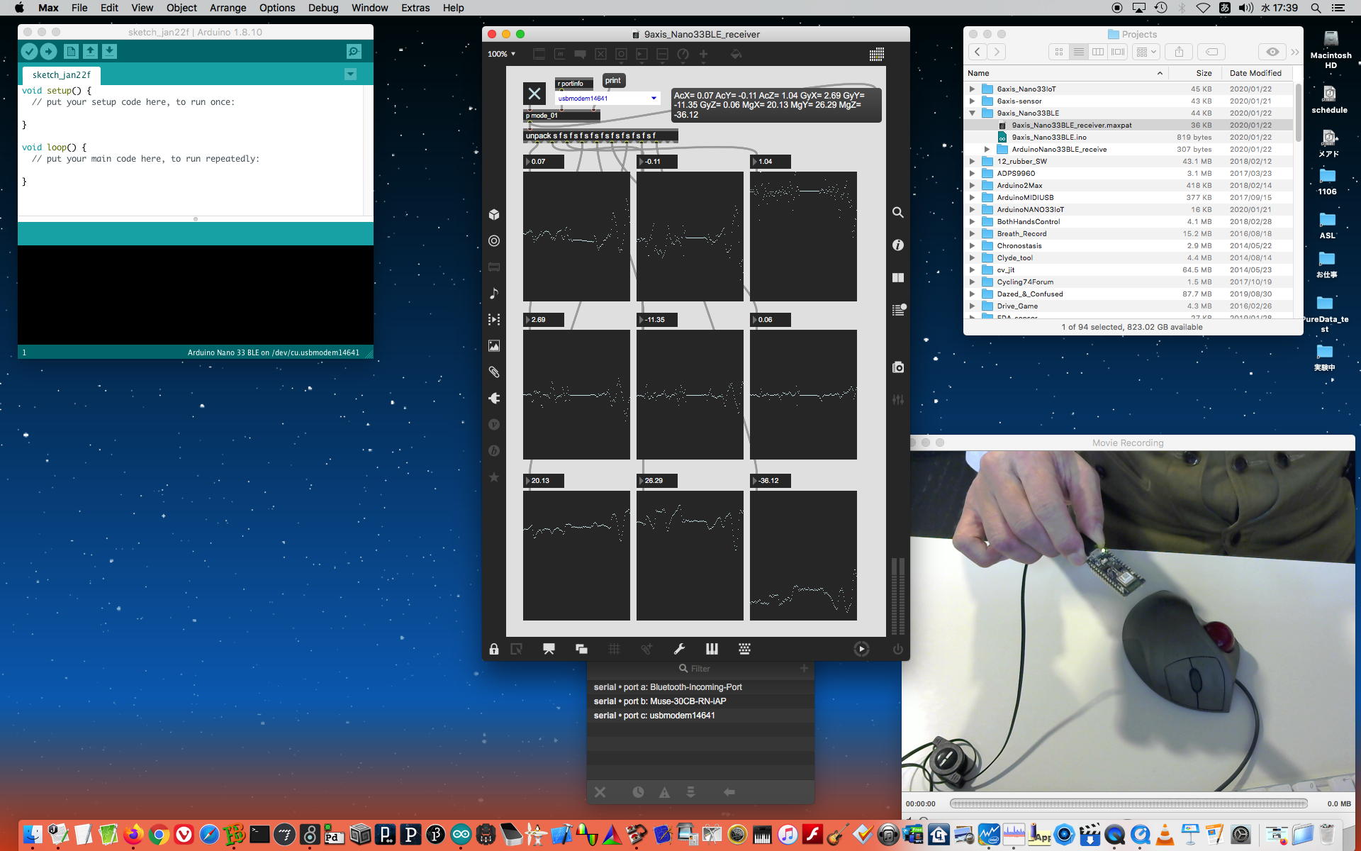 2限にゼミ、昼休み〜3限に1回生のアポ、4-5限に3回生のアポ・・・とギッシリ詰まった水曜日である。 卒制の4回生二人もかなりギリギリに追い込まれていて、今期最終のゼミもそこそこで終了した。 昨日から悩んでいる現象は、簡単に整理すると以下のようなものであり、まさに「謎」である。つまり、Arduinoとしては書き込み成功して、Arduino IDEのシリアルモニタで動作確認できているので、おそらくArduinoNano33BLEも正常に9軸センサデータをUSBシリアルで送信している「筈」なのだが、何故かMaxでは、ArduinoNano33IoTの情報はちゃんと受信しているのにArduinoNano33BLEの情報は受信できていない・・・「ようにしか見えない」のである。(;_;)