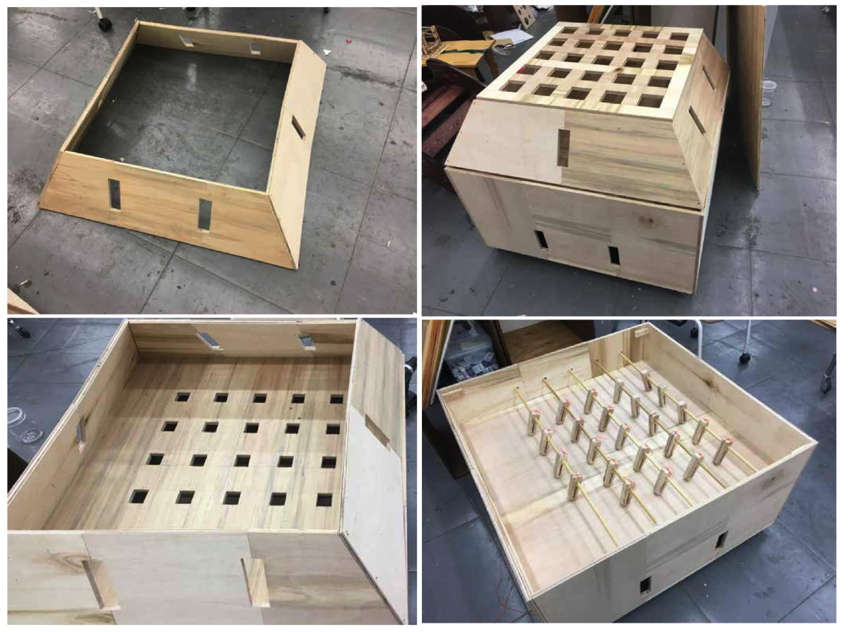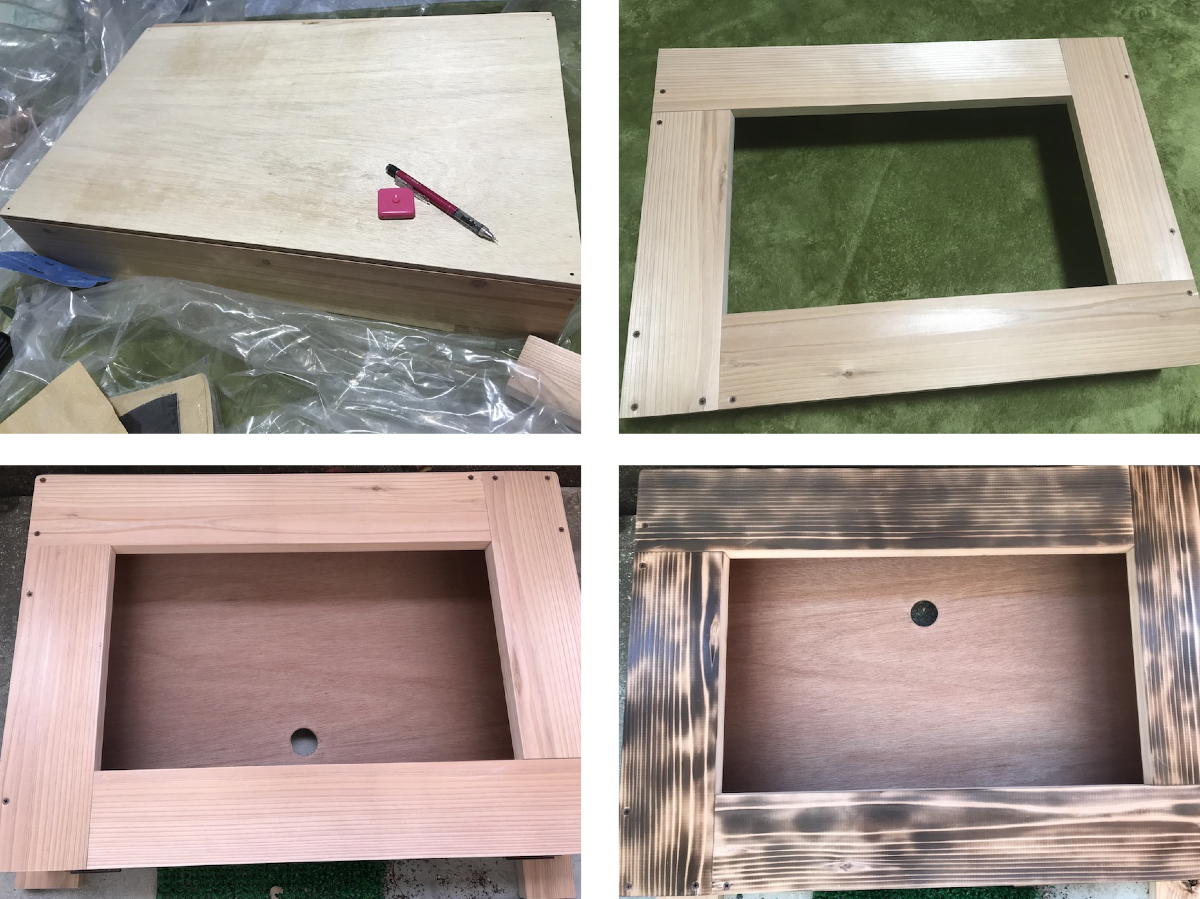 しかしこれで驚いてはいけない。 先週のゼミでは、以下のようにゼミ3回生の田口さんが実家で進めた木材加工の写真、そしてさらにゼミ4回生の平田クンの卒業制作の途中経過の写真でゼミ一同が感嘆したところである。 バーナーで焦がす渋い加工、さらに複雑な「造形からくり」ゲームに至っては、なんとしても完成・動作を期待してしまう。 やはり、パソコンやスマホの中に閉じているコンテンツと違って、インスタレーション作品は現実の空間に存在して、人間と直にインタラクションすることが「命」であり、このような木材加工による造形というのは重要で、圧倒的な存在感となるのだ・・・と実感した。