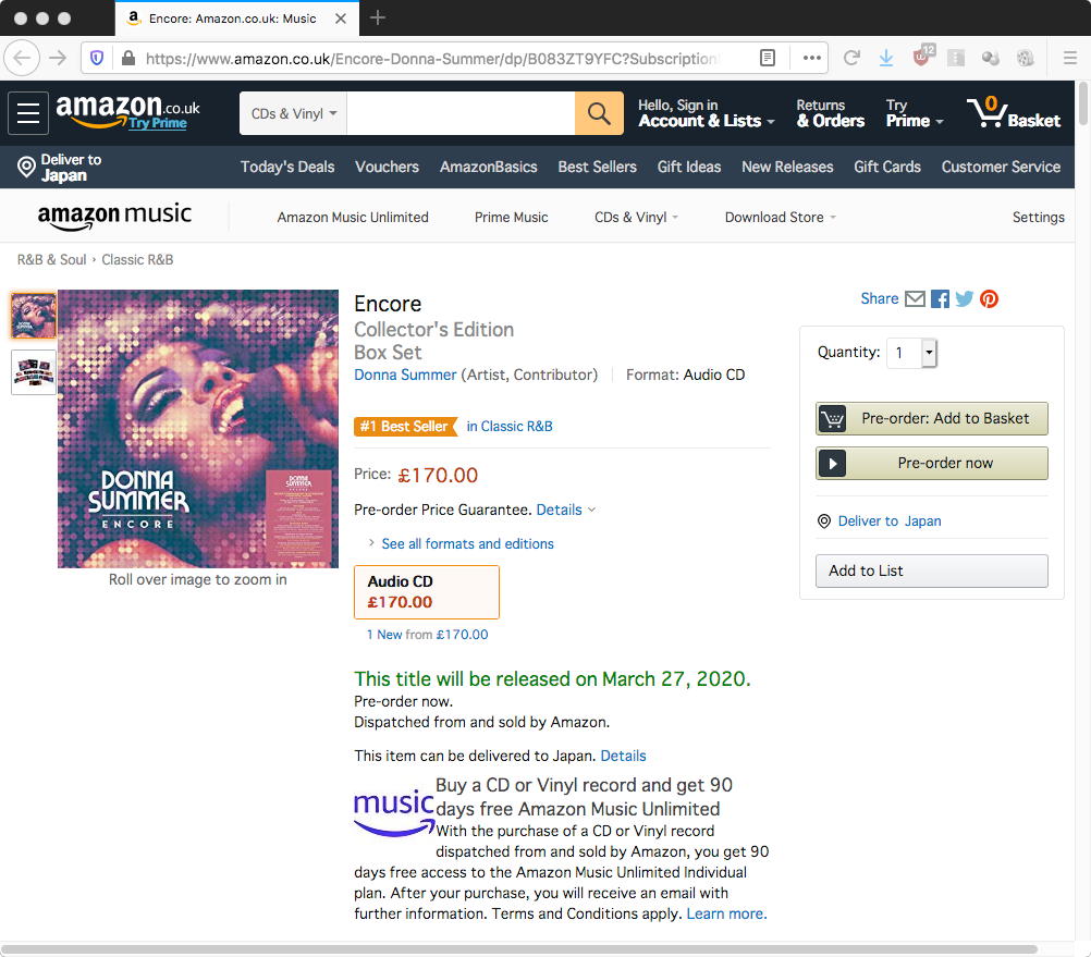 そんな中、ネットからは「ドナ・サマーのキャリアを網羅した全329曲入りCD33枚組ボックスセット『Encore』発売」というニュースが流れてきた。 調べてみると英国のアマゾンで早期予約すれば170ポンド(23,000円)程度である。 思わずクリックしかけたが、考えてみれば、僕はドナ・サマーは好きだが、彼女の曲をそんなに幅広く数多く知っているわけでもなく、ここで33枚組CDを購入しても、果たして生きているうちに全部を聞くかどうか・・・と自問して、グッと堪えた。 とりあえずここで、以下のように解説と曲目一覧を置いていくだけにすることにした。