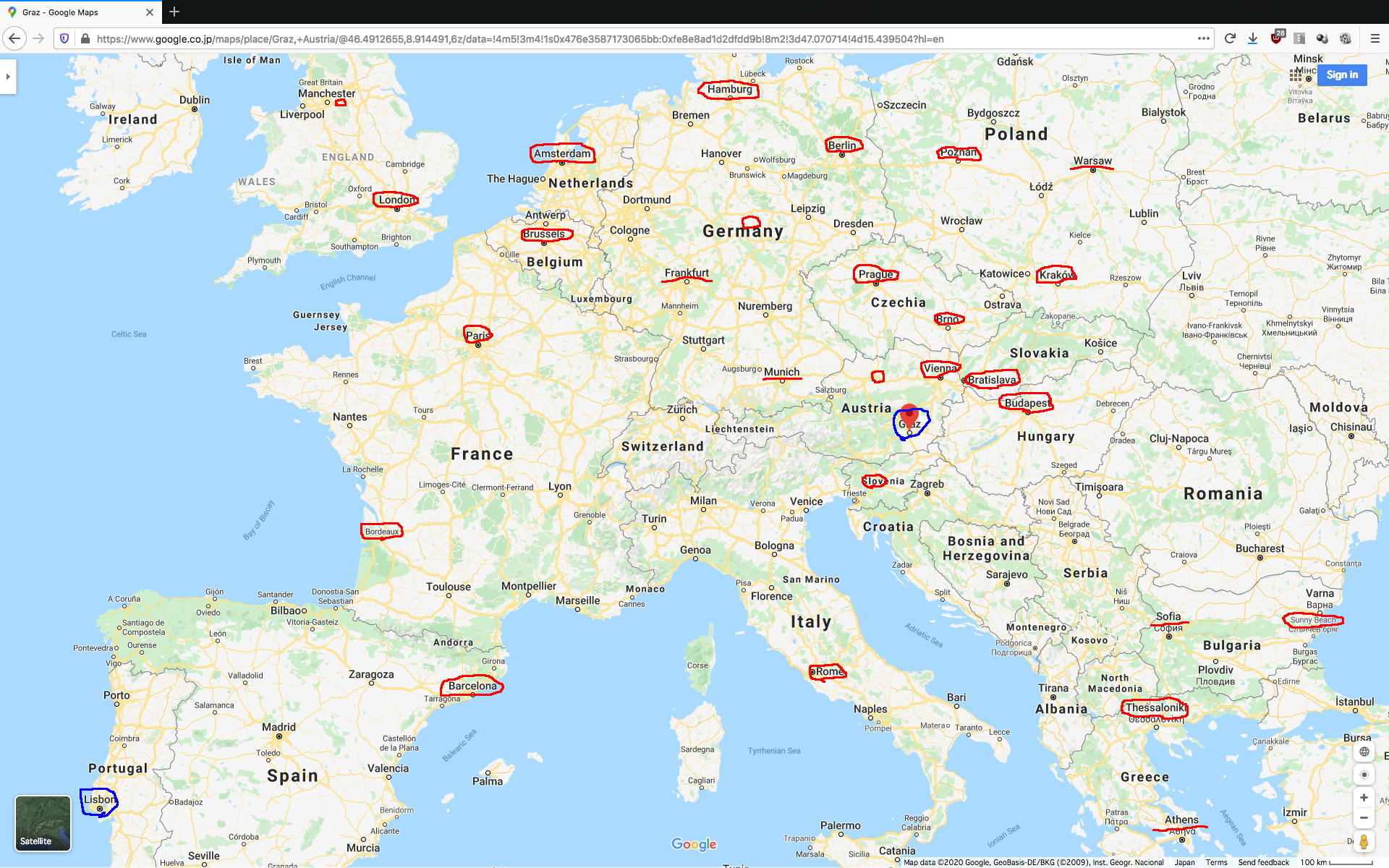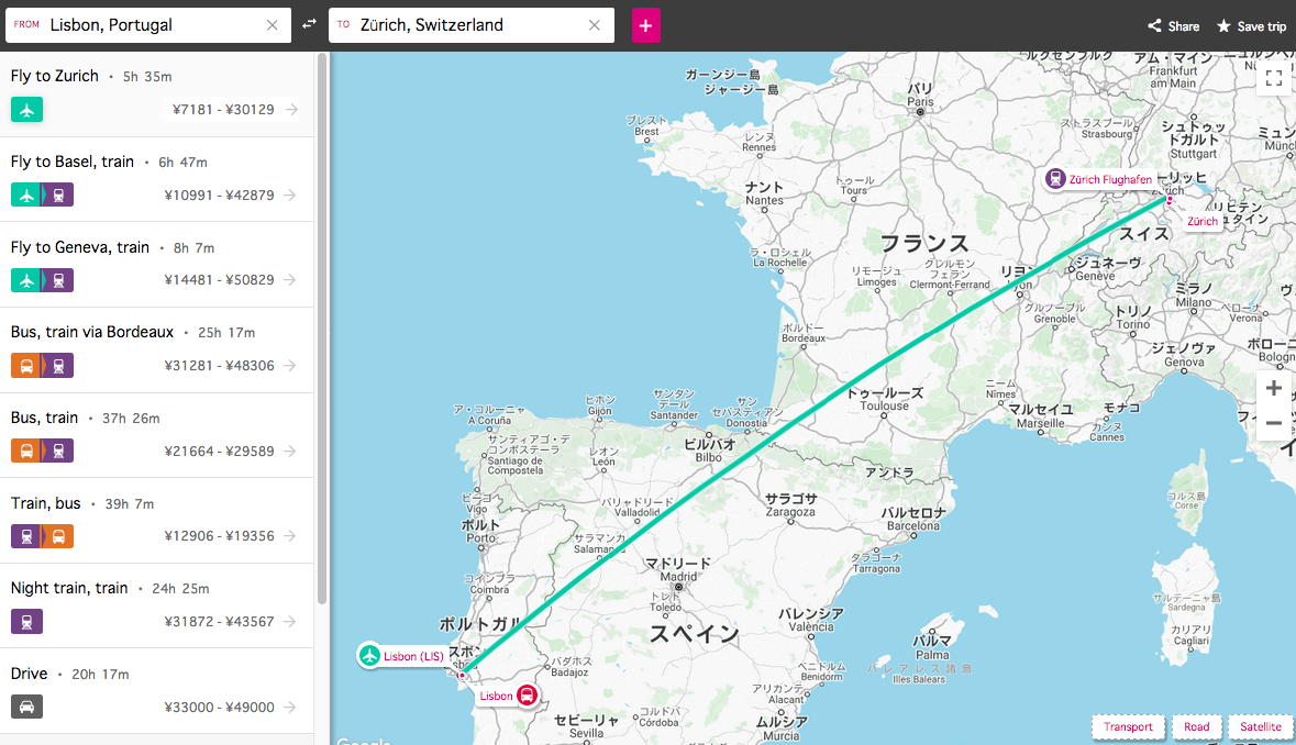そして午前中に懸案だったSUAC特別研究の申請をとりあえずやっつけたところで、久しぶりにちょっとした時間が生まれた。 そこで上のようにGoogle Mapでヨーロッパを出して、とりあえず赤ペンで「過去に行った(泊まった)ところ」・「過去に通過(乗り継ぎ)したところ」にマークしてみると、結構たくさんあった。 懐かしい(^_^)。 そして、ここで青ペンでマークした「リスボン(ポルトガル)」と「グラーツ(オーストリア)」の2箇所が、なかなか悩ましい検討事項なのだった。 今年の9月の欧州ツアーでは、ICDVRAT2020からAudioMostly2020と梯子しようと思うと、けっこう遠いこの2都市を移動する必要があるのだ。 そこでYAHOO.COMで「Lisbon to Graz」と入れると、 こんな便利なページ が出てきてくれた。 このように なんと以下の9通りの行き方があるという。